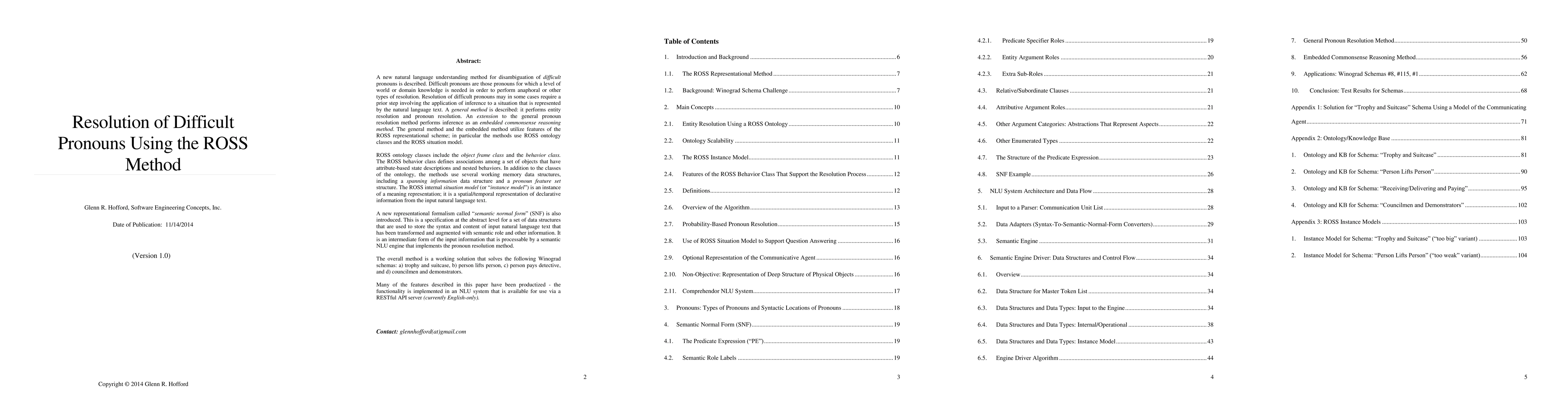 A new natural language understanding method for disambiguation of difficult pronouns is described. Difficult pronouns are those pronouns for which a level of world or domain knowledge is needed in order to perform anaphoral or other types of resolution. Resolution of difficult pronouns may in some cases require a prior step involving the application of inference to a situation that is represented by the natural language text. A general method is described: it performs entity resolution and pronoun resolution. An extension to the general pronoun resolution method performs inference as an embedded commonsense reasoning method. The general method and the embedded method utilize features of the ROSS representational scheme; in particular the methods use ROSS ontology classes and the ROSS situation model. The overall method is a working solution that solves the following Winograd schemas: a) trophy and suitcase, b) person lifts person, c) person pays detective, and d) councilmen and demonstrators.