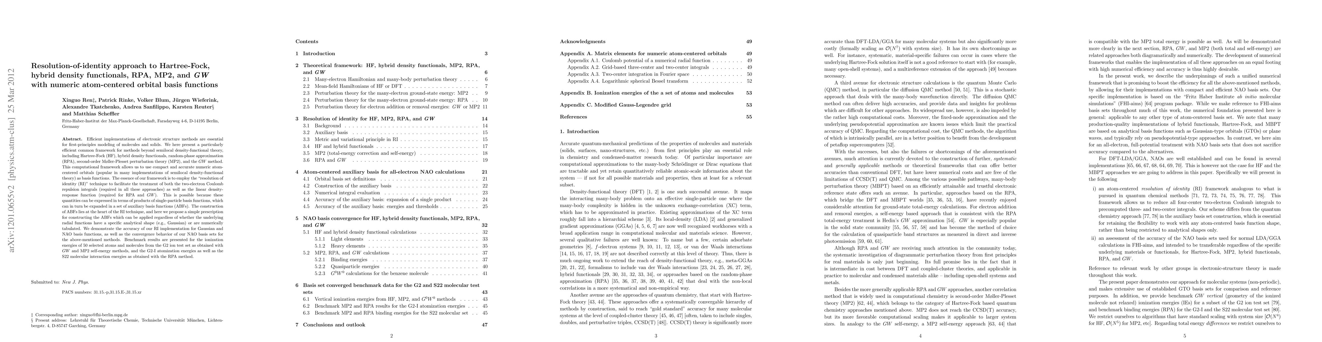 This paper presents an efficient computational framework for various electronic structure methods using numeric atom-centered orbitals, employing the resolution of identity technique to handle two-electron integrals and linear density-response functions. Benchmark results show accurate ionization energies and interaction energies for a range of atoms and molecules.