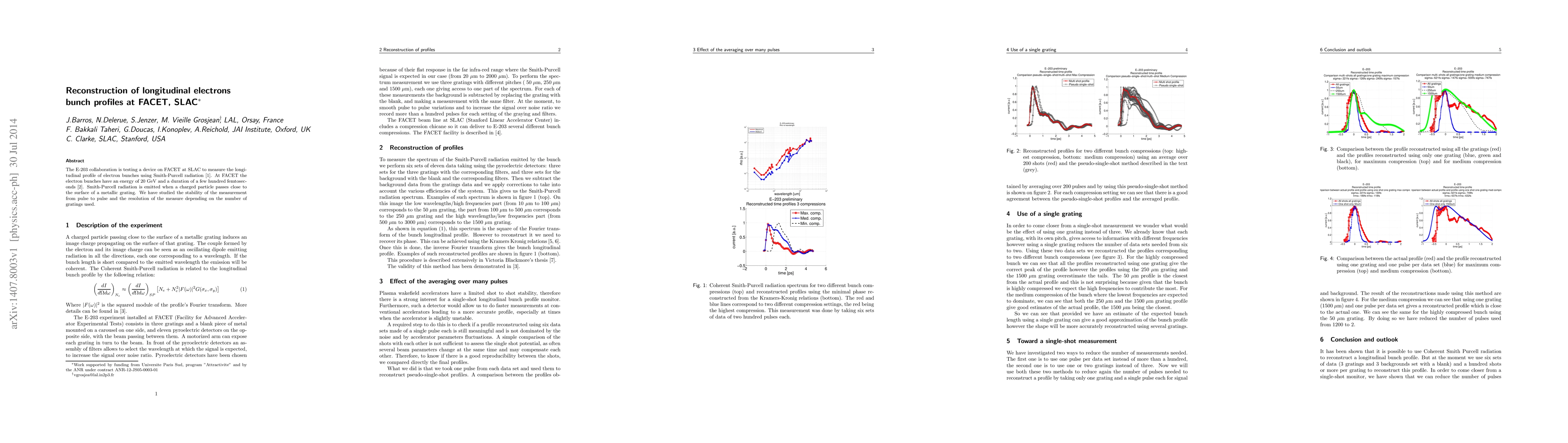 The E-203 collaboration investigates the resolution of longitudinal profile measures of 20 GeV electron bunches using Smith-Purcell radiation emitted from metallic gratings at FACET. The study examines the stability and resolution improvements with varying numbers of gratings and pulses.