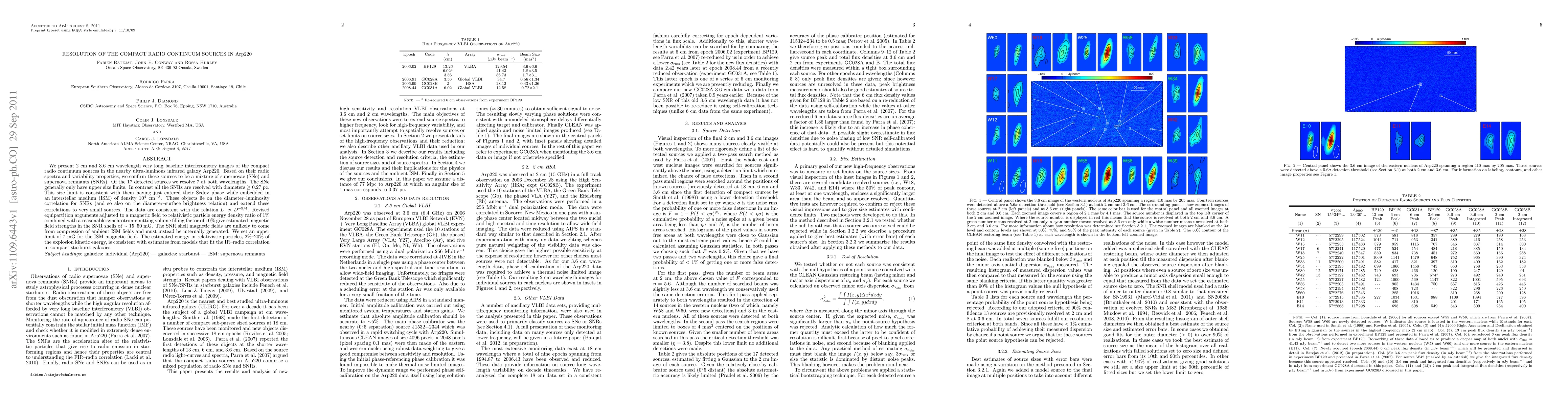 We present 2 cm and 3.6 cm wavelength very long baseline interferometry images of the compact radio continuum sources in the nearby ultra-luminous infrared galaxy Arp220. Based on their radio spectra and variability properties, we confirm these sources to be a mixture of supernovae (SNe) and supernova remnants (SNRs). Of the 17 detected sources we resolve 7 at both wavelengths. The SNe generally only have upper size limits. In contrast all the SNRs are resolved with diameters {\geq} 0.27 pc. This size limit is consistent with them having just entered their Sedov phase while embedded in an interstellar medium (ISM) of density 10^4 cm^{-3} . These objects lie on the diameter-luminosity correlation for SNRs (and so also on the diameter-surface brightness relation) and extend these correlations to very small sources. The data are consistent with the relation L {\propto} D^{-9/4}. Revised equipartition arguments adjusted to a magnetic field to relativistic particle energy density ratio of 1% combined with a reasonable synchrotron-emitting volume filling factor of 10% give estimated magnetic field strengths in the SNR shells of ~ 15-50 mG. The SNR shell magnetic fields are unlikely to come from compression of ambient ISM fields and must instead be internally generated. We set an upper limit of 7 mG for the ISM magnetic field. The estimated energy in relativistic particles, 2%-20% of the explosion kinetic energy, is consistent with estimates from models that fit the IR-radio correlation in compact starburst galaxies.