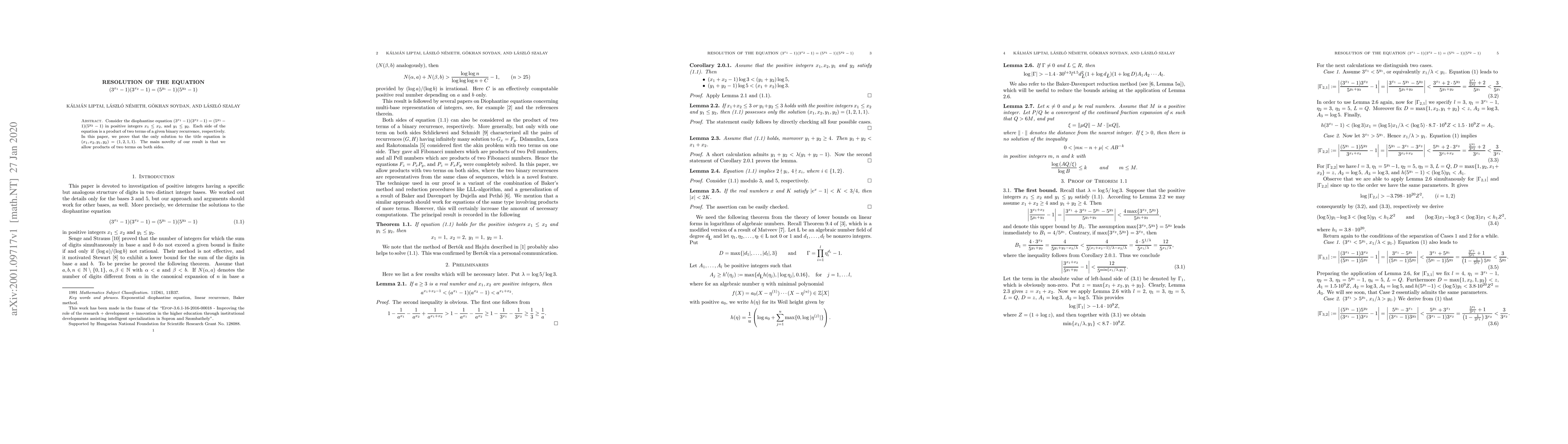 This paper proves that the Diophantine equation $(3^{x_1}-1)(3^{x_2}-1)=(5^{y_1}-1)(5^{y_2}-1)$ has a unique solution in positive integers, specifically $(x_1,x_2,y_1,y_2)=(1,2,1,1)$, with the novelty of allowing products of two terms on each side.