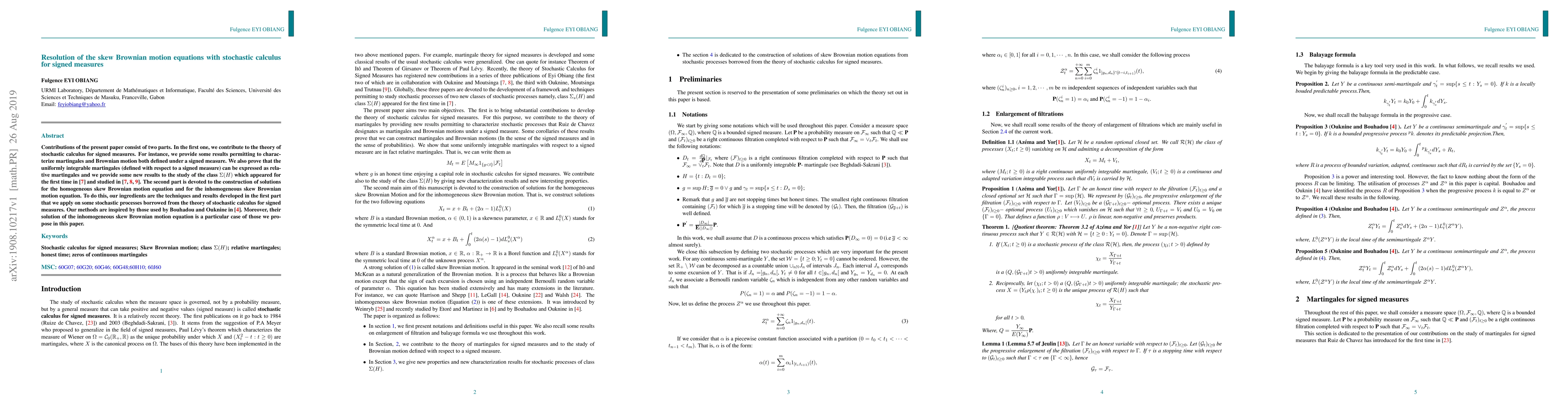 Contributions of the present paper consist of two parts. In the first one, we contribute to the theory of stochastic calculus for signed measures. For instance, we provide some results permitting to characterize martingales and Brownian motion both defined under a signed measure. We also prove that the uniformly integrable martingales (defined with respect to a signed measure) can be expressed as relative martingales and we provide some new results to the study of the class $\Sigma(H)$ which appeared for the first time in \cite{f} and studied in \cite{f,e,o}. The second part is devoted to the construction of solutions for the \textbf{homogeneous skew Brownian motion equation} and for the \textbf{inhomogeneous skew Brownian motion equation}. To do this, our ingredients are the techniques and results developed in the first part that we apply on some stochastic processes borrowed from the theory of stochastic calculus for signed measures. Our methods are inspired by those used by Bouhadou and Ouknine in \cite{siam}. Moreover, their solution of the inhomogeneous skew Brownian motion equation is a particular case of those we propose in this paper.