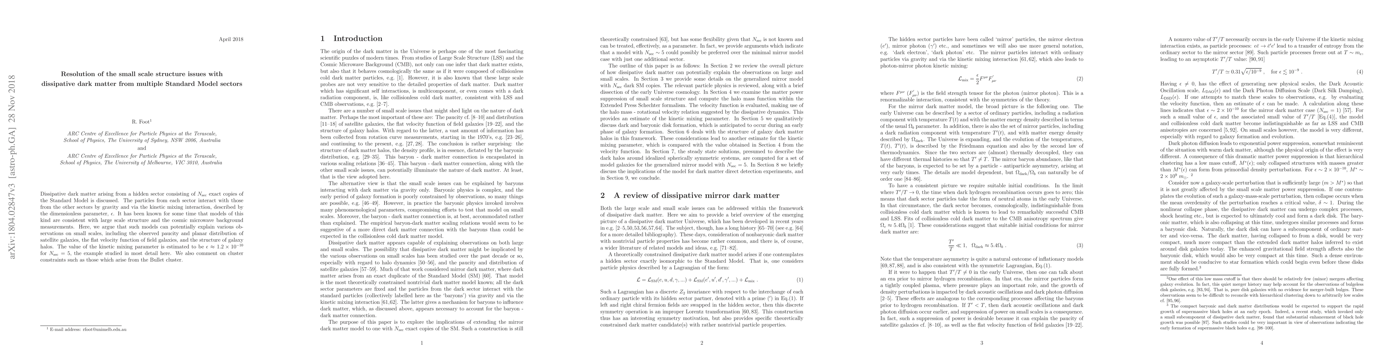 Dissipative dark matter arising from a hidden sector consisting of $N_{\rm sec}$ exact copies of the Standard Model is discussed. The particles from each sector interact with those from the other sectors by gravity and via the kinetic mixing interaction, described by the dimensionless parameter, $\epsilon$. It has been known for some time that models of this kind are consistent with large scale structure and the cosmic microwave background measurements. Here, we argue that such models can potentially explain various observations on small scales, including the observed paucity and planar distribution of satellite galaxies, the flat velocity function of field galaxies, and the structure of galaxy halos. The value of the kinetic mixing parameter is estimated to be $\epsilon \approx 1.2 \times 10^{-10}$ for $N_{\rm sec} = 5$, the example studied in most detail here. We also comment on cluster constraints such as those which arise from the Bullet cluster.