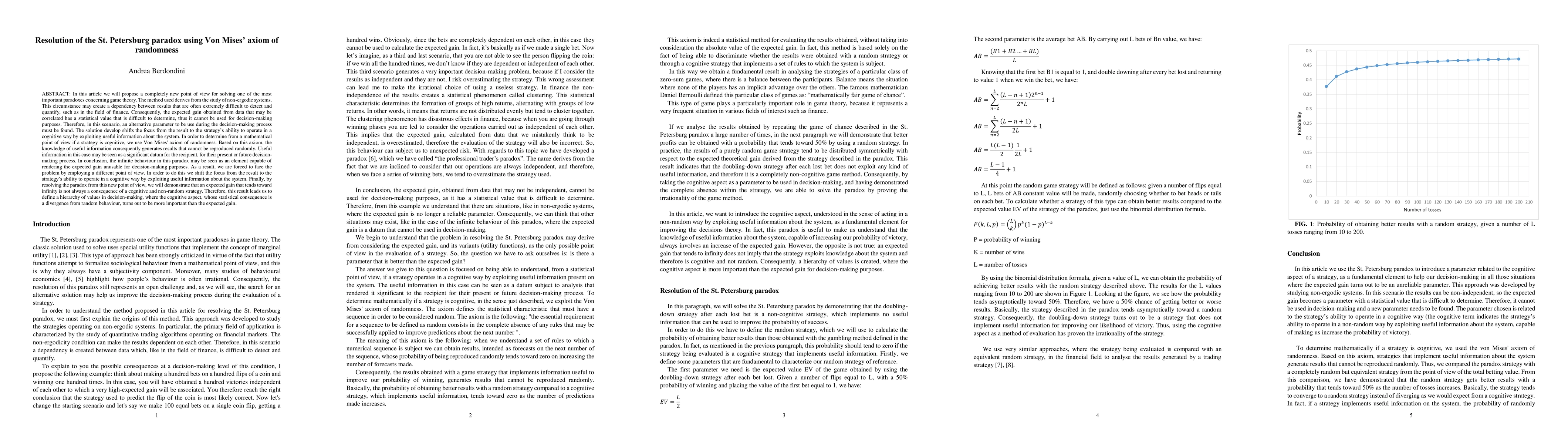 This paper resolves the St. Petersburg paradox by employing Von Mises' axiom of randomness, arguing that cognitive strategies leveraging useful information can lead to non-random results. It concludes that cognitive decision-making, rather than infinite expected gain, is paramount in value hierarchy.