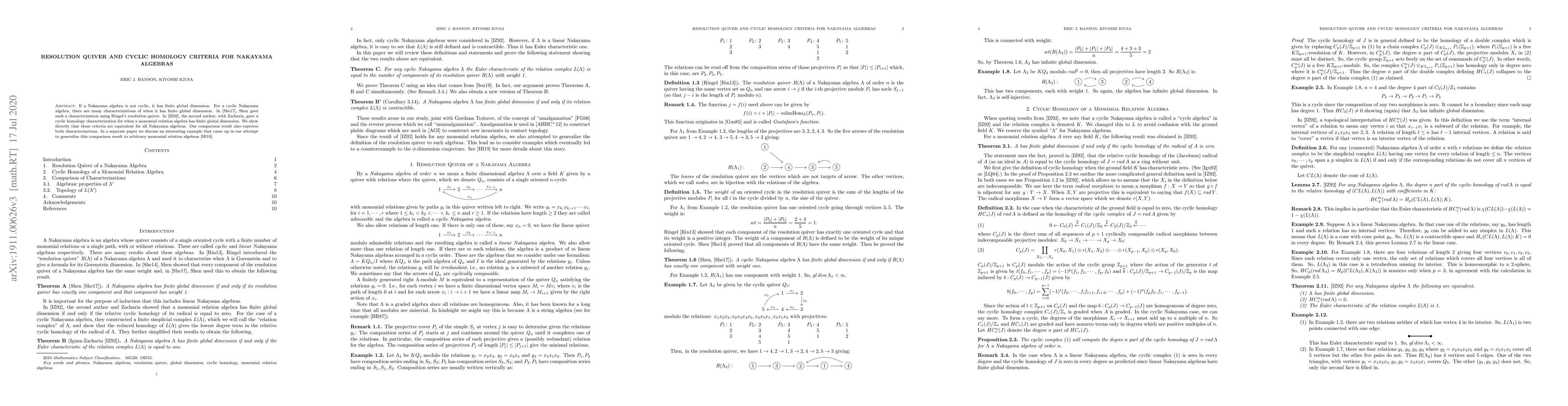 If a Nakayama algebra is not cyclic, it has finite global dimension. For a cyclic Nakayama algebra, there are many characterizations of when it has finite global dimension. In [She17], Shen gave such a characterization using Ringel's resolution quiver. In [IZ92], the second author, with Zacharia, gave a cyclic homology characterization for when a monomial relation algebra has finite global dimension. We show directly that these criteria are equivalent for all Nakayama algebras. Our comparison result also reproves both characterizations. In a separate paper we discuss an interesting example that came up in our attempt to generalize this comparison result to arbitrary monomial relation algebras [HI19].