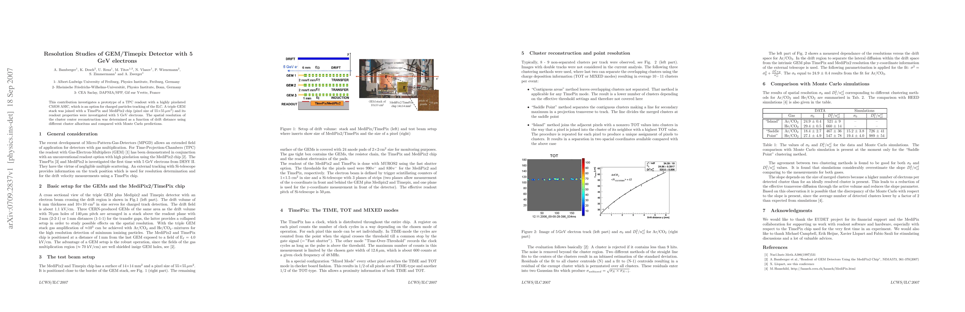 This study evaluates a prototype TPC readout combining a triple GEM stack with a TimePix detector for electron tracking at 5 GeV, assessing spatial resolution and comparing reconstruction results with Monte Carlo simulations. The spatial resolution of the cluster center was determined as a function of drift distance using various algorithms.