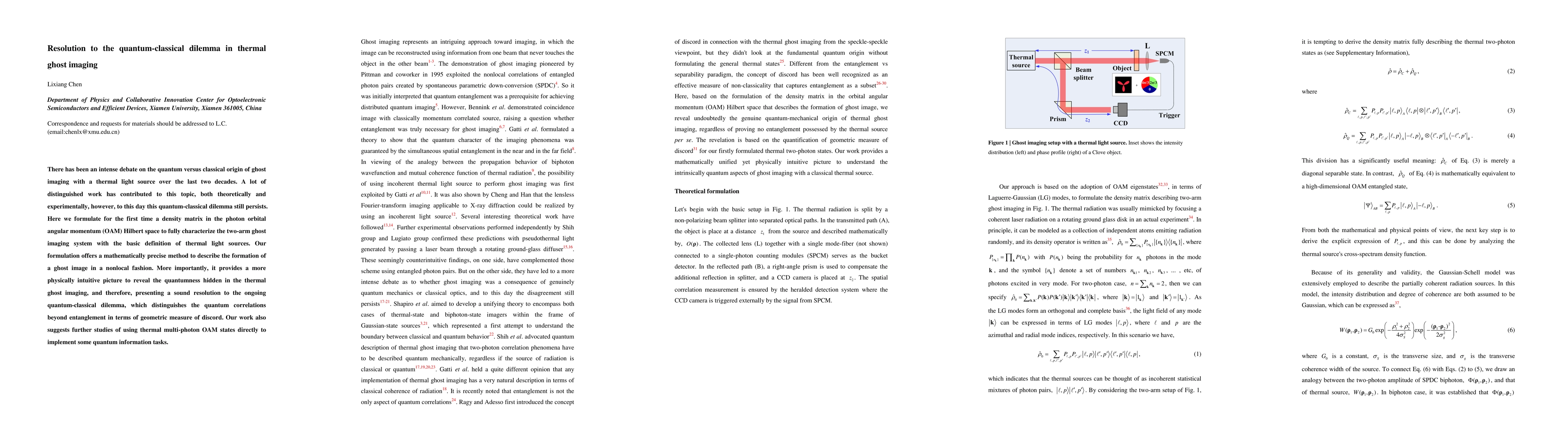 This paper resolves the quantum-classical dilemma in thermal ghost imaging by formulating a density matrix in photon orbital angular momentum space, offering a precise method to describe ghost image formation and revealing quantum correlations beyond entanglement through geometric discord. This approach suggests potential applications in quantum information tasks using thermal multi-photon states.