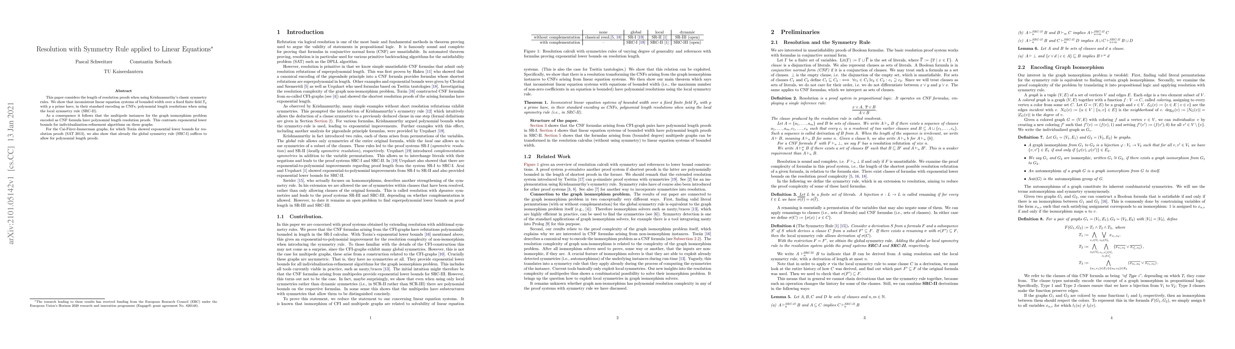 This paper demonstrates that linear equation systems with bounded width over a finite field can be resolved using Krishnamurthy's symmetry rules to achieve polynomial length proofs. It also shows that graph isomorphism instances encoded as CNF formulas benefit from similar polynomial resolutions, contrasting with exponential lower bounds for other algorithms.