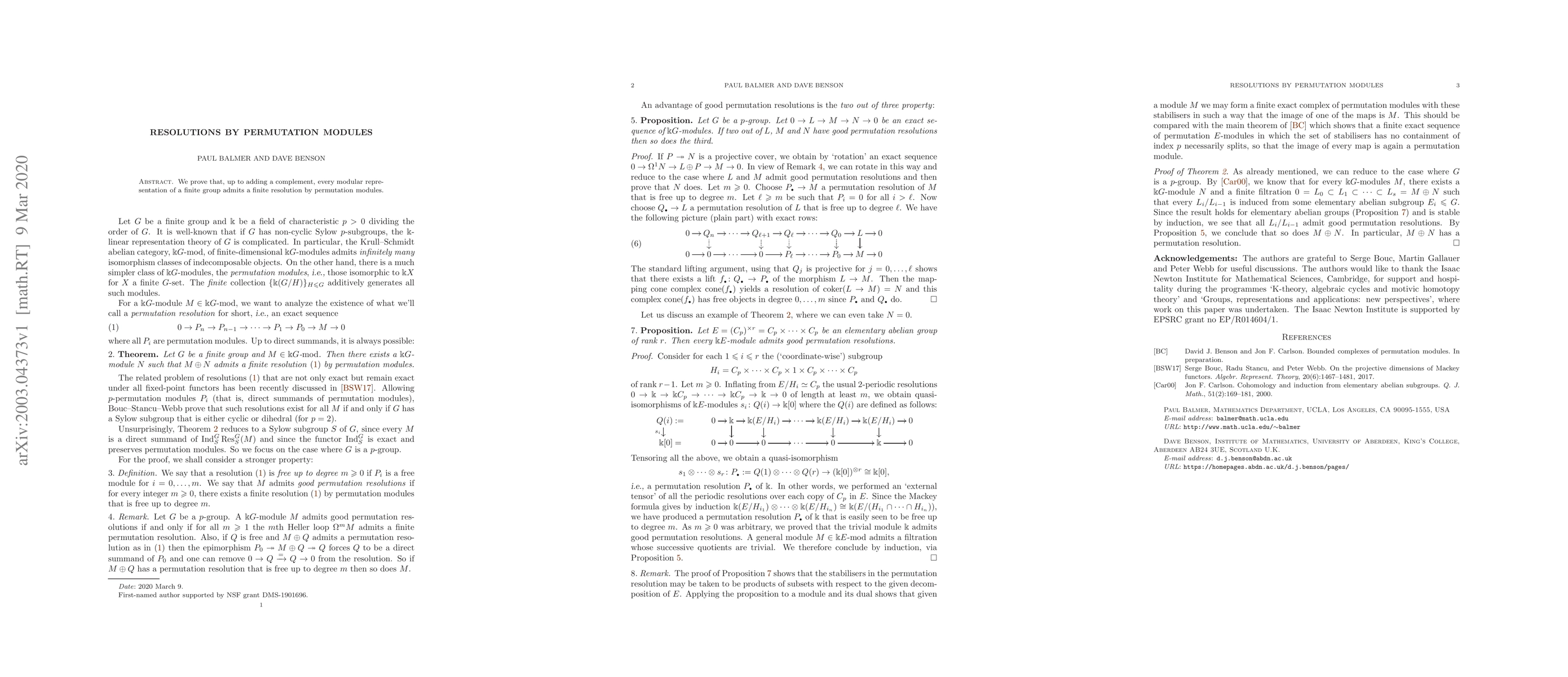 Summary: The paper demonstrates that any modular representation of a finite group can be extended, if necessary by adding a complement, to a finite resolution constructed from permutation modules. This result provides a significant structural insight into the representations of finite groups.