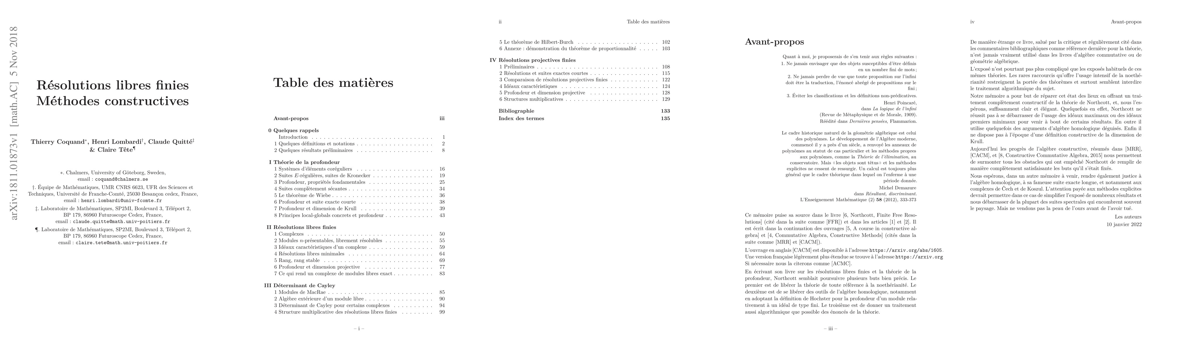 In this memoir, we give a completely constructive version of the celebrate book 'Finite Free Resolutions' by Northcott, and of some other results related to the depth \`a la Hochster, the Cayley complexes and their determinants, and the finite projective resolutions.