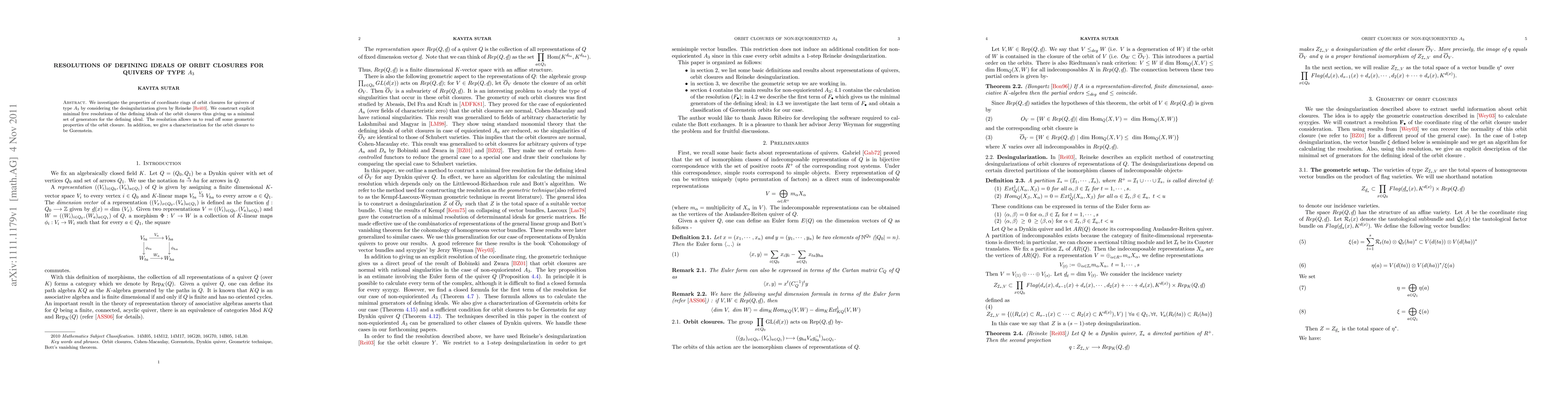 This paper investigates the minimal free resolutions of defining ideals for orbit closures in quivers of type $A_3$, providing explicit generators and characterizing Gorenstein properties, and offering insights into the geometric properties of these closures.