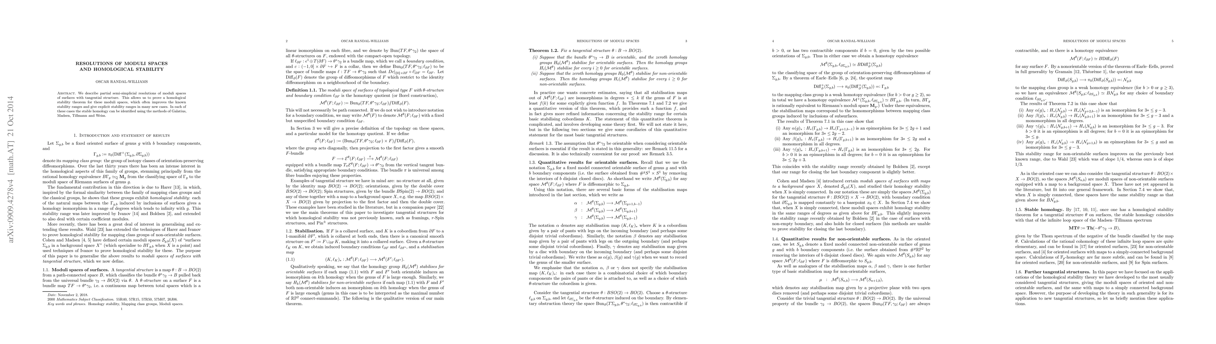 The paper describes partial semi-simplicial resolutions of moduli spaces of surfaces with tangential structure, utilizing these resolutions to prove a homological stability theorem for these moduli spaces, often improving known stability ranges and providing explicit stability ranges in many new cases.
