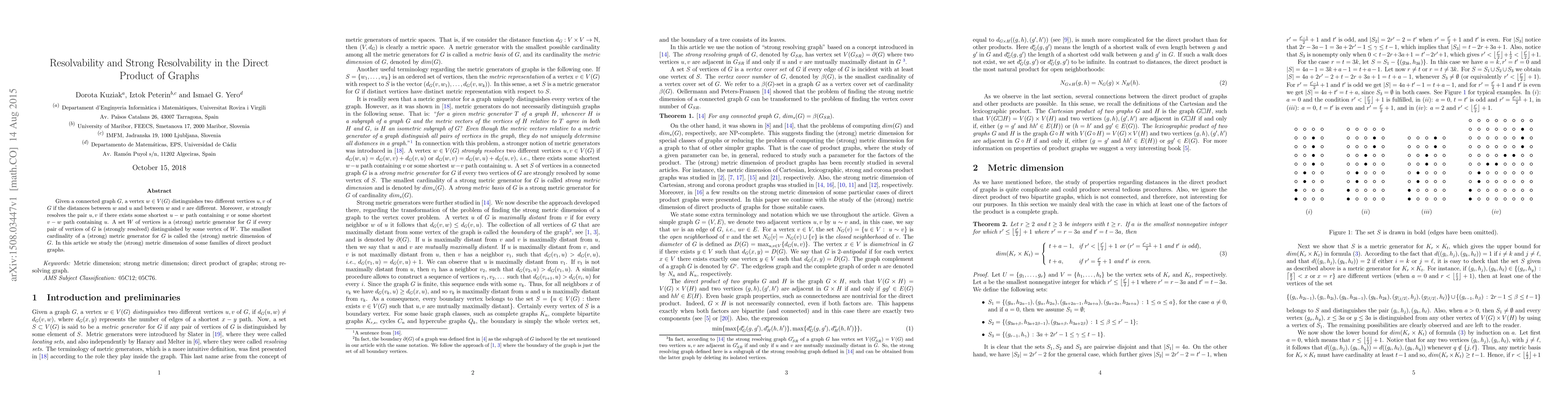 This paper investigates the smallest number of vertices needed to distinguish every pair of vertices in a direct product graph, focusing on various families of graphs with different resolvability properties.