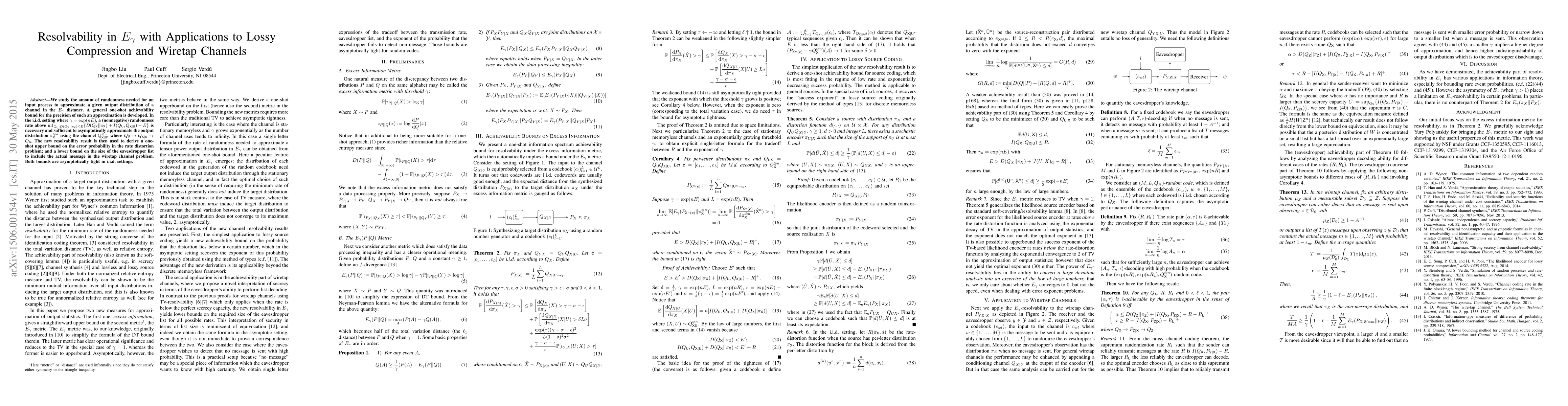 We study the amount of randomness needed for an input process to approximate a given output distribution of a channel in the $E_{\gamma}$ distance. A general one-shot achievability bound for the precision of such an approximation is developed. In the i.i.d.~setting where $\gamma=\exp(nE)$, a (nonnegative) randomness rate above $\inf_{Q_{\sf U}: D(Q_{\sf X}||\pi_{\sf X})\le E} \{D(Q_{\sf X}||\pi_{\sf X})+I(Q_{\sf U},Q_{\sf X|U})-E\}$ is necessary and sufficient to asymptotically approximate the output distribution $\pi_{\sf X}^{\otimes n}$ using the channel $Q_{\sf X|U}^{\otimes n}$, where $Q_{\sf U}\to Q_{\sf X|U}\to Q_{\sf X}$. The new resolvability result is then used to derive a one-shot upper bound on the error probability in the rate distortion problem, and a lower bound on the size of the eavesdropper list to include the actual message in the wiretap channel problem. Both bounds are asymptotically tight in i.i.d.~settings.