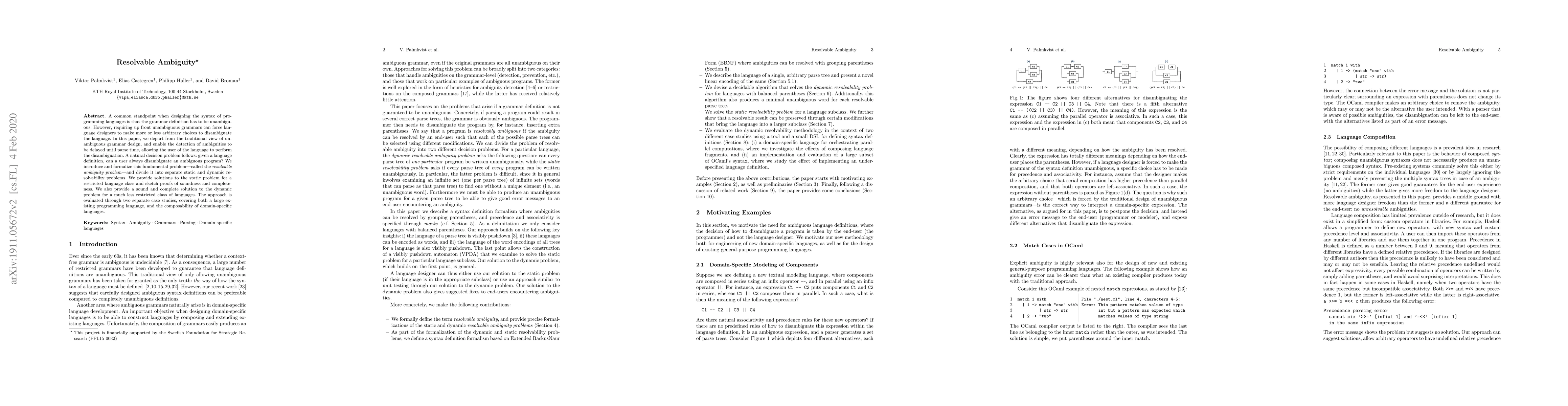 A common standpoint when designing the syntax of programming languages is that the grammar definition has to be unambiguous. However, requiring up front unambiguous grammars can force language designers to make more or less arbitrary choices to disambiguate the language. In this paper, we depart from the traditional view of unambiguous grammar design, and enable the detection of ambiguities to be delayed until parse time, allowing the user of the language to perform the disambiguation. A natural decision problem follows: given a language definition, can a user always disambiguate an ambiguous program? We introduce and formalize this fundamental problem - called the resolvable ambiguity problem - and divide it into separate static and dynamic resolvability problems. We provide solutions to the static problem for a restricted language class and sketch proofs of soundness and completeness. We also provide a sound and complete solution to the dynamic problem for a much less restricted class of languages. The approach is evaluated through two separate case studies, covering both a large existing programming language, and the composability of domain-specific languages.