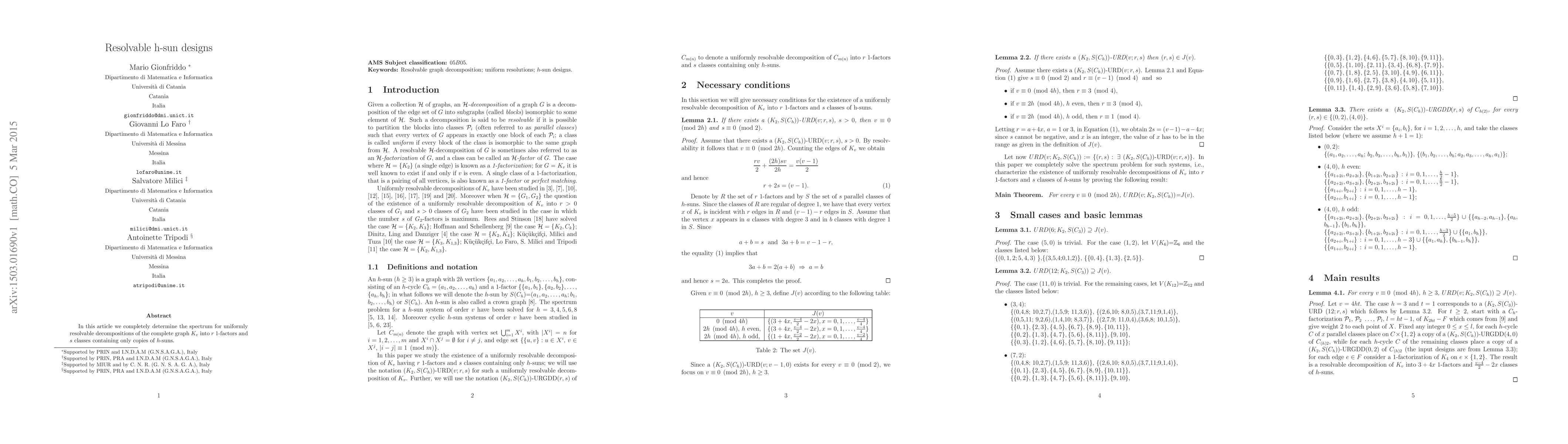 Researchers determined the spectrum for uniformly resolvable decompositions of the complete graph K_v into r 1-factors and s classes containing only copies of h-suns, providing a key finding in the field of graph theory.