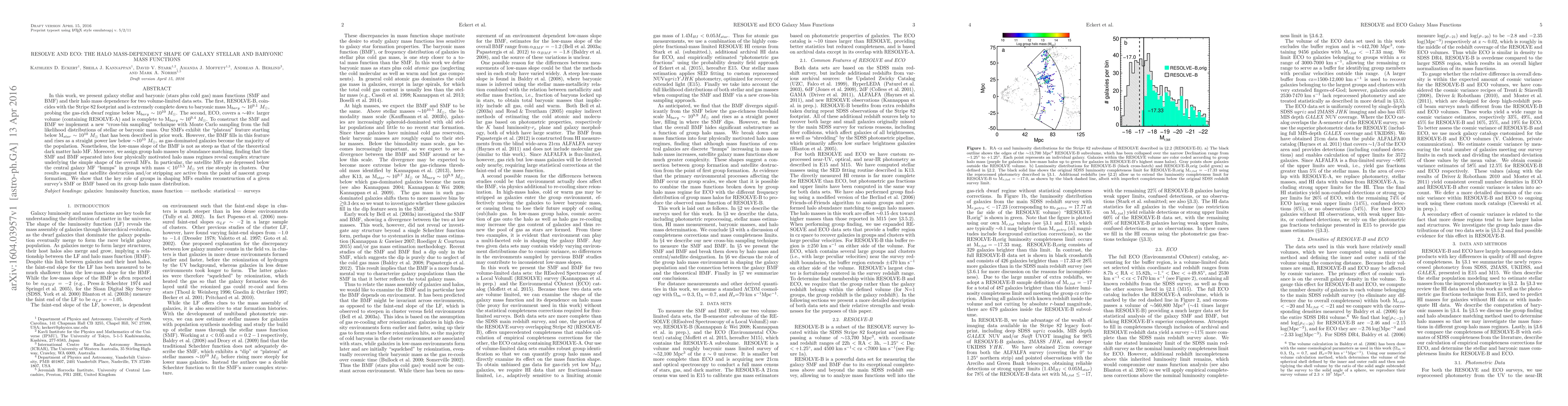 In this work, we present galaxy stellar and baryonic (stars plus cold gas) mass functions (SMF and BMF) and their halo mass dependence for two volume-limited data sets. The first, RESOLVE-B, coincides with the Stripe 82 footprint and is extremely complete down to baryonic mass Mbary ~ 10^9.1 Msun, probing the gas-rich dwarf regime below Mbary ~ 10^10 Msun. The second, ECO, covers a ~40 times larger volume (containing RESOLVE-A) and is complete to Mbary ~ 10^9.4 Msun. To construct the SMF and BMF we implement a new "cross-bin sampling" technique with Monte Carlo sampling from the full likelihood distributions of stellar or baryonic mass. Our SMFs exhibit the "plateau" feature starting below Mstar ~ 10^10 Msun that has been described in prior work. However, the BMF fills in this feature and rises as a straight power law below ~10^10 Msun, as gas-dominated galaxies become the majority of the population. Nonetheless, the low-mass slope of the BMF is not as steep as that of the theoretical dark matter halo MF. Moreover, we assign group halo masses by abundance matching, finding that the SMF and BMF separated into four physically motivated halo mass regimes reveal complex structure underlying the simple shape of the overall MFs. In particular, the satellite MFs are depressed below the central galaxy MF "humps" in groups with mass <10^13.5 Msun yet rise steeply in clusters. Our results suggest that satellite destruction and/or stripping are active from the point of nascent group formation. We show that the key role of groups in shaping MFs enables reconstruction of a given survey's SMF or BMF based on its group halo mass distribution.