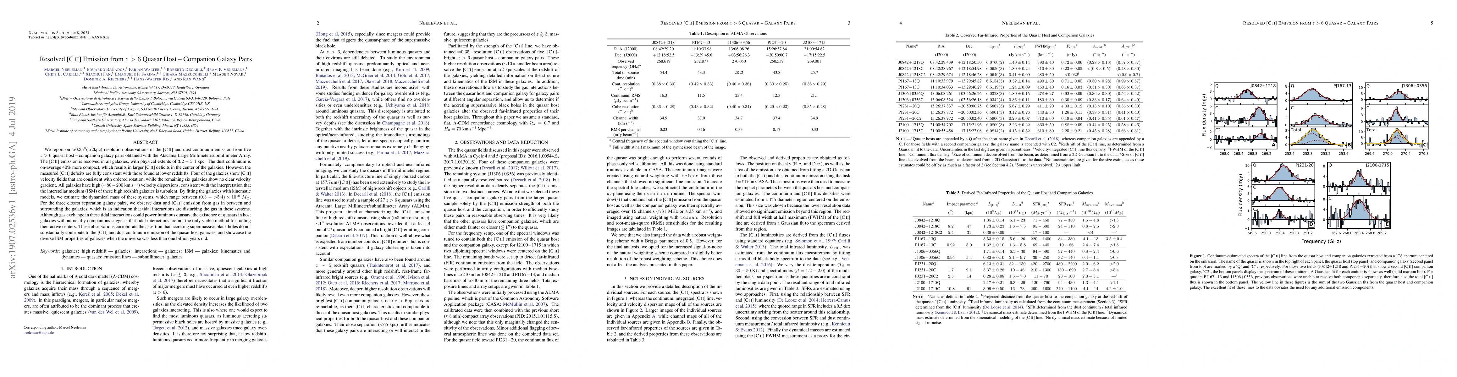 This paper reports high-resolution observations of [CII] and dust continuum emissions from five z>6 quasar host-companion galaxy pairs, revealing turbulent interstellar medium and diverse ISM properties in early galaxies. The study finds that tidal interactions may influence gas dynamics but are not the sole mechanism for fueling quasars.