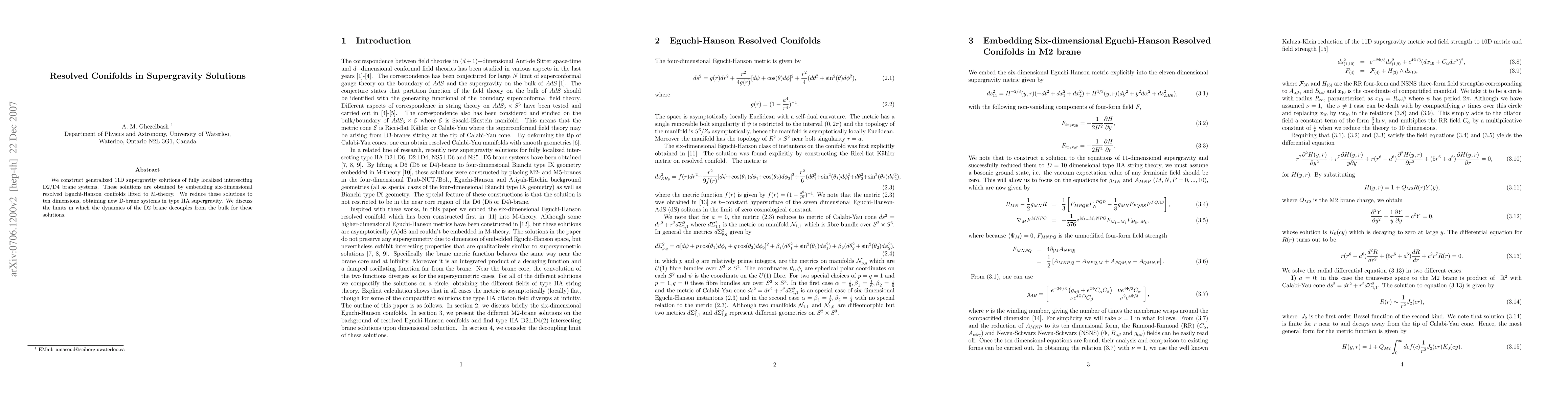 This paper constructs new 11D supergravity solutions from intersecting D2/D4 brane systems by embedding resolved Eguchi-Hanson conifolds in M-theory, then reduces them to ten dimensions to reveal novel D-brane systems in type IIA supergravity. It also explores scenarios where D2 brane dynamics decouple from the bulk.