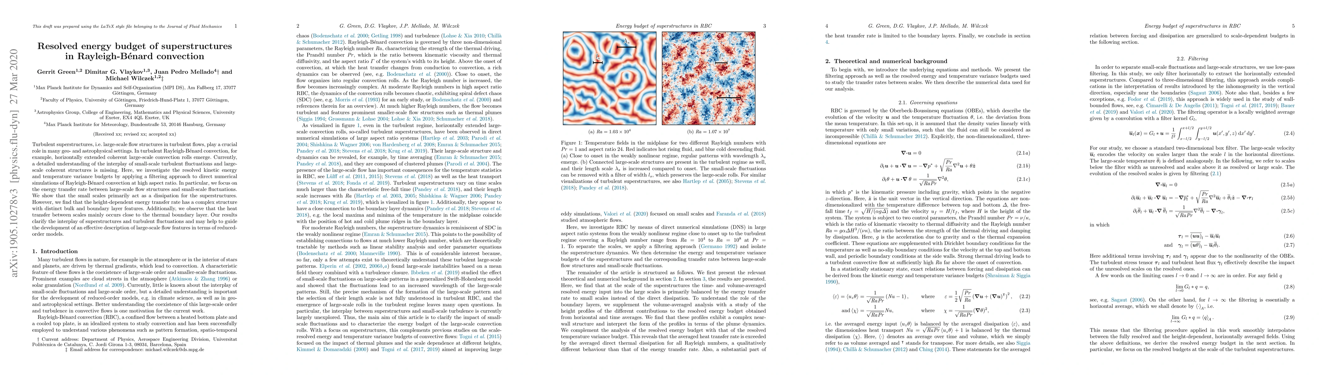 Turbulent superstructures, i.e. large-scale flow structures in turbulent flows, play a crucial role in many geo- and astrophysical settings. In turbulent Rayleigh-B\'{e}nard convection, for example, horizontally extended coherent large-scale convection rolls emerge. Currently, a detailed understanding of the interplay of small-scale turbulent fluctuations and large-scale coherent structures is missing. Here, we investigate the resolved kinetic energy and temperature variance budgets by applying a filtering approach to direct numerical simulations of Rayleigh-B\'{e}nard convection at high aspect ratio. In particular, we focus on the energy transfer rate between large-scale flow structures and small-scale fluctuations. We show that the small scales primarily act as a dissipation for the superstructures. However, we find that the height-dependent energy transfer rate has a complex structure with distinct bulk and boundary layer features. Additionally, we observe that the heat transfer between scales mainly occurs close to the thermal boundary layer. Our results clarify the interplay of superstructures and turbulent fluctuations and may help to guide the development of an effective description of large-scale flow features in terms of reduced-order models.