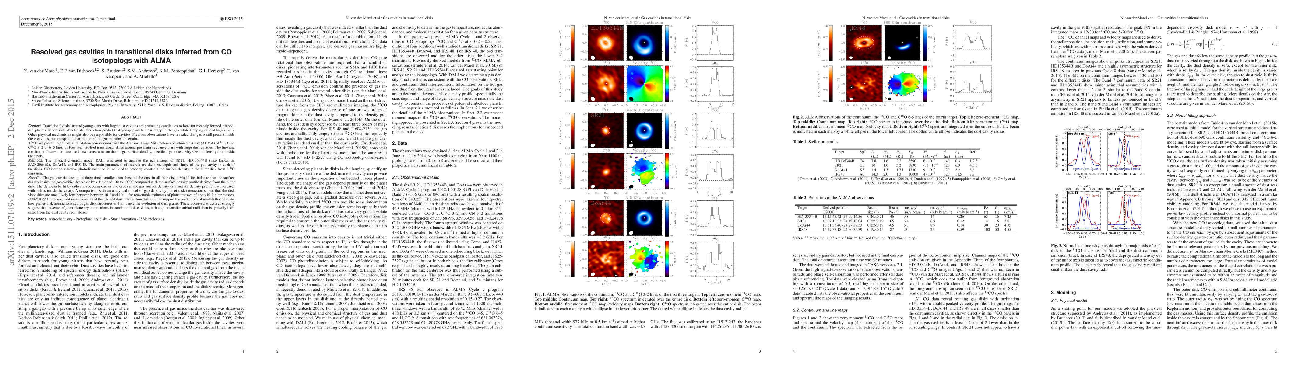 This study uses ALMA observations of CO isotopologues to resolve gas cavities in transitional disks, revealing that they are up to three times smaller than dust cavities. The analysis indicates a significant density drop inside the gas cavities, supporting models of planet-disk interactions and suggesting low disk viscosities, which imply the presence of giant planets sculpting these structures.