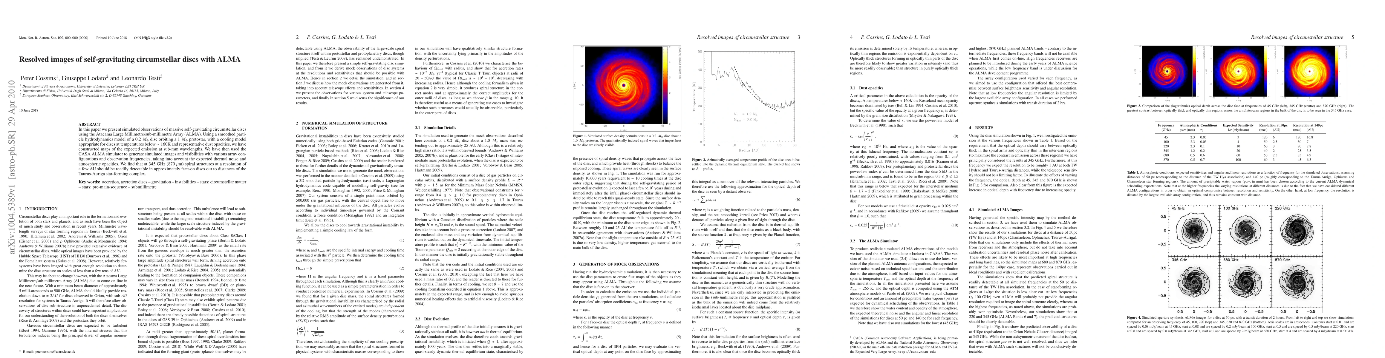 This paper presents simulated ALMA observations of a $0.2M_{\odot}$ circumstellar disc around a $1M_{\odot}$ protostar, revealing that spiral structures at a resolution of a few AU can be detected at 345 GHz in face-on discs up to the Taurus-Auriga complex. The study uses a smoothed particle hydrodynamics model and ALMA simulator to generate realistic images and visibilities.
