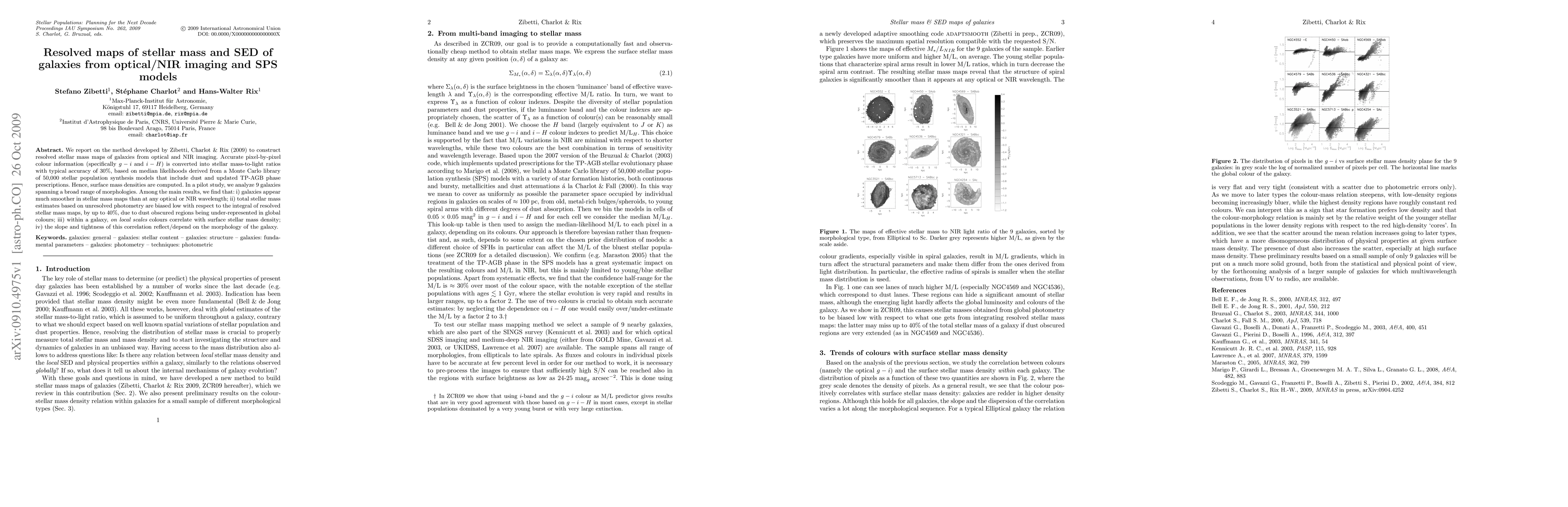 We report on the method developed by Zibetti, Charlot and Rix (2009) to construct resolved stellar mass maps of galaxies from optical and NIR imaging. Accurate pixel-by-pixel colour information (specifically g-i and i-H) is converted into stellar mass-to-light ratios with typical accuracy of 30%, based on median likelihoods derived from a Monte Carlo library of 50,000 stellar population synthesis models that include dust and updated TP-AGB phase prescriptions. Hence, surface mass densities are computed. In a pilot study, we analyze 9 galaxies spanning a broad range of morphologies. Among the main results, we find that: i) galaxies appear much smoother in stellar mass maps than at any optical or NIR wavelength; ii) total stellar mass estimates based on unresolved photometry are biased low with respect to the integral of resolved stellar mass maps, by up to 40%, due to dust obscured regions being under-represented in global colours; iii) within a galaxy, on local scales colours correlate with surface stellar mass density; iv) the slope and tightness of this correlation reflect/depend on the morphology of the galaxy.