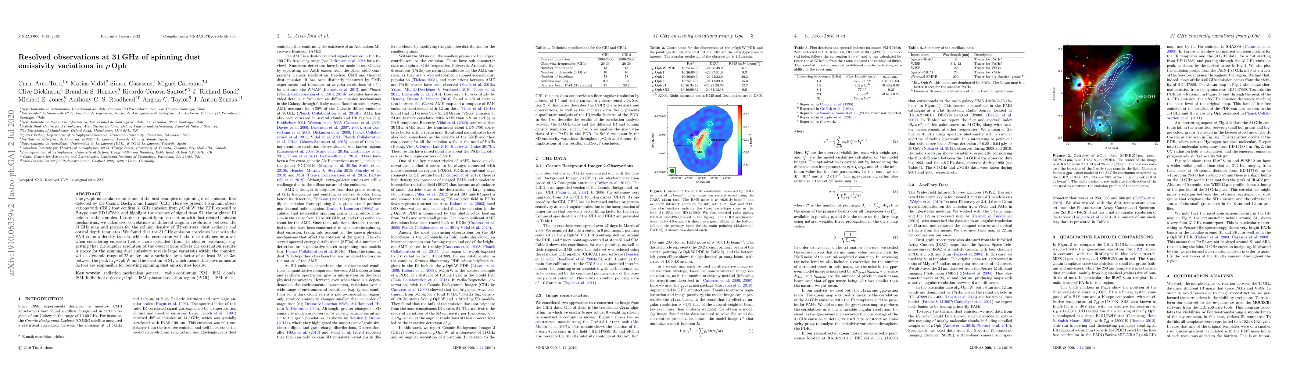 The $\rho$ Oph molecular cloud is one of the best examples of spinning dust emission, first detected by the Cosmic Background Imager (CBI). Here we present 4.5 arcmin observations with CBI 2 that confirm 31 GHz emission from $\rho$ Oph W, the PDR exposed to B-type star HD 147889, and highlight the absence of signal from S1, the brightest IR nebula in the complex. In order to quantify an association with dust-related emission mechanisms, we calculated correlations at different angular resolutions between the 31 GHz map and proxies for the column density of IR emitters, dust radiance and optical depth templates. We found that the 31 GHz emission correlates best with the PAH column density tracers, while the correlation with the dust radiance improves when considering emission that is more extended (from the shorter baselines), suggesting that the angular resolution of the observations affects the correlation results. A proxy for the spinning dust emissivity reveals large variations within the complex, with a dynamic range of 25 at 3$\sigma$ and a variation by a factor of at least 23, at 3$\sigma$, between the peak in $\rho$ Oph W and the location of S1, which means that environmental factors are responsible for boosting spinning dust emissivities locally.