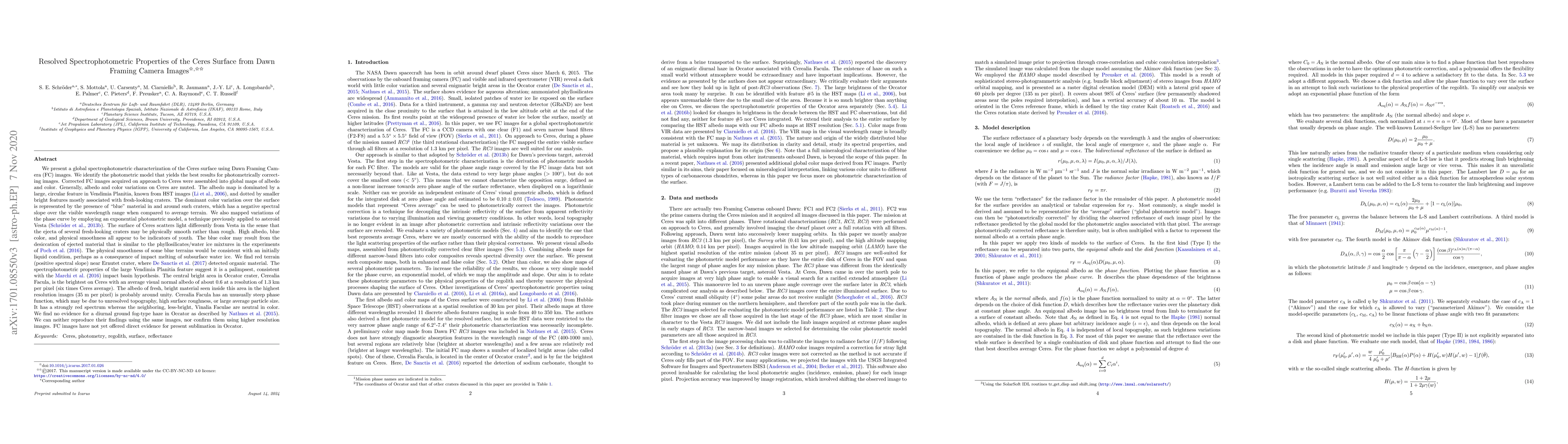This research provides a global spectrophotometric analysis of Ceres' surface using Dawn Framing Camera images, revealing muted albedo and color variations. The study identifies bright features in fresh craters and a large circular feature in Vendimia Planitia, suggesting it is a palimpsest, while also noting the presence of blue material indicative of desiccated ejected material and potentially liquid conditions.