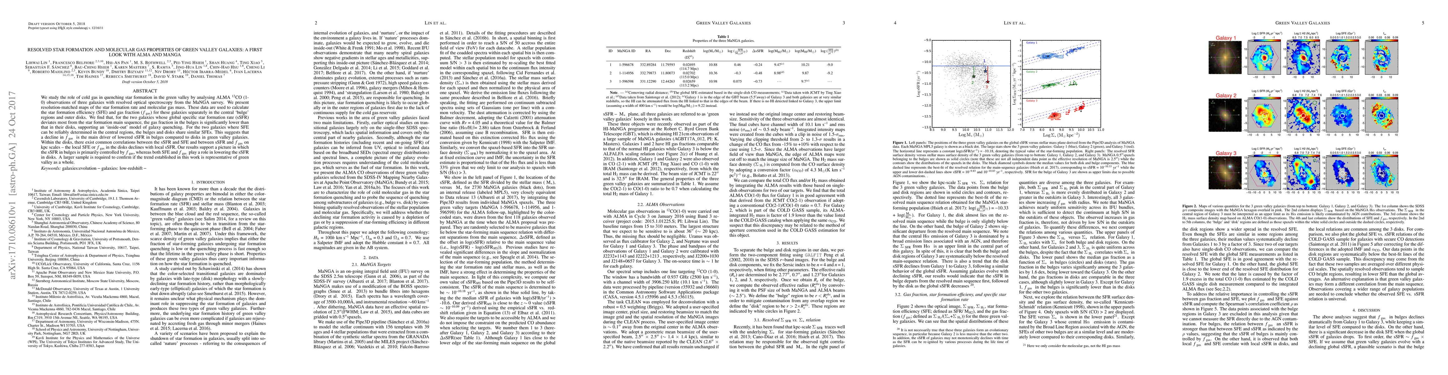 We study the role of cold gas in quenching star formation in the green valley by analysing ALMA $^{12}$CO (1-0) observations of three galaxies with resolved optical spectroscopy from the MaNGA survey. We present resolution-matched maps of the star formation rate and molecular gas mass. These data are used to calculate the star formation efficiency (SFE) and gas fraction ($f_{\rm~gas}$) for these galaxies separately in the central `bulge' regions and outer disks. We find that, for the two galaxies whose global specific star formation rate (sSFR) deviates most from the star formation main sequence, the gas fraction in the bulges is significantly lower than that in their disks, supporting an `inside-out' model of galaxy quenching. For the two galaxies where SFE can be reliably determined in the central regions, the bulges and disks share similar SFEs. This suggests that a decline in $f_{\rm~gas}$ is the main driver of lowered sSFR in bulges compared to disks in green valley galaxies. Within the disks, there exist common correlations between the sSFR and SFE and between sSFR and $f_{\rm~gas}$ on kpc scales -- the local SFE or $f_{\rm~gas}$ in the disks declines with local sSFR. Our results support a picture in which the sSFR in bulges is primarily controlled by $f_{\rm~gas}$, whereas both SFE and $f_{\rm~gas}$ play a role in lowering the sSFR in disks. A larger sample is required to confirm if the trend established in this work is representative of green valley as a whole.