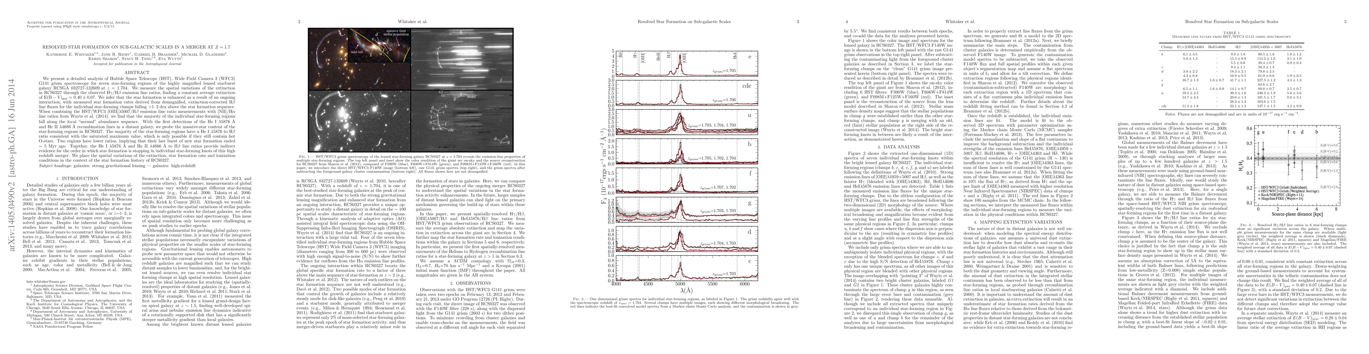 We present a detailed analysis of Hubble Space Telescope (HST), Wide Field Camera 3 (WFC3) G141 grism spectroscopy for seven star-forming regions of the highly magnified lensed starburst galaxy RCSGA 032727-132609 at z=1.704. We measure the spatial variations of the extinction in RCS0327 through the observed H$\gamma$/H$\beta$ emission line ratios, finding a constant average extinction of $\mathrm{E(B-V)_{gas}}=0.40\pm0.07$. We infer that the star formation is enhanced as a result of an ongoing interaction, with measured star formation rates derived from demagnified, extinction-corrected H$\beta$ line fluxes for the individual star-forming clumps falling >1-2 dex above the star formation sequence. When combining the HST/WFC3 [OIII]$\lambda$5007/H$\beta$ emission line ratio measurements with [NII]/H$\alpha$ line ratios from Wuyts et a. (2014), we find that the majority of the individual star-forming regions fall along the local "normal" abundance sequence. With the first detections of the He I $\lambda$5876 and He II $\lambda$4686 recombination lines in a distant galaxy, we probe the massive-star content of the star-forming regions in RCS0327. The majority of the star-forming regions have a He I $\lambda$5876 to H$\beta$ ratio consistent with the saturated maximum value, which is only possible if they still contain hot O-stars. Two regions have lower ratios, implying that their last burst of new star formation ended ~5 Myr ago. Together, the He I $\lambda$5876 and He II $\lambda$4686 to H$\beta$ line ratios provide indirect evidence for the order in which star formation is stopping in individual star-forming knots of this high redshift merger. We place the spatial variations of the extinction, star formation rate and ionization conditions in the context of the star formation history of RCS0327.