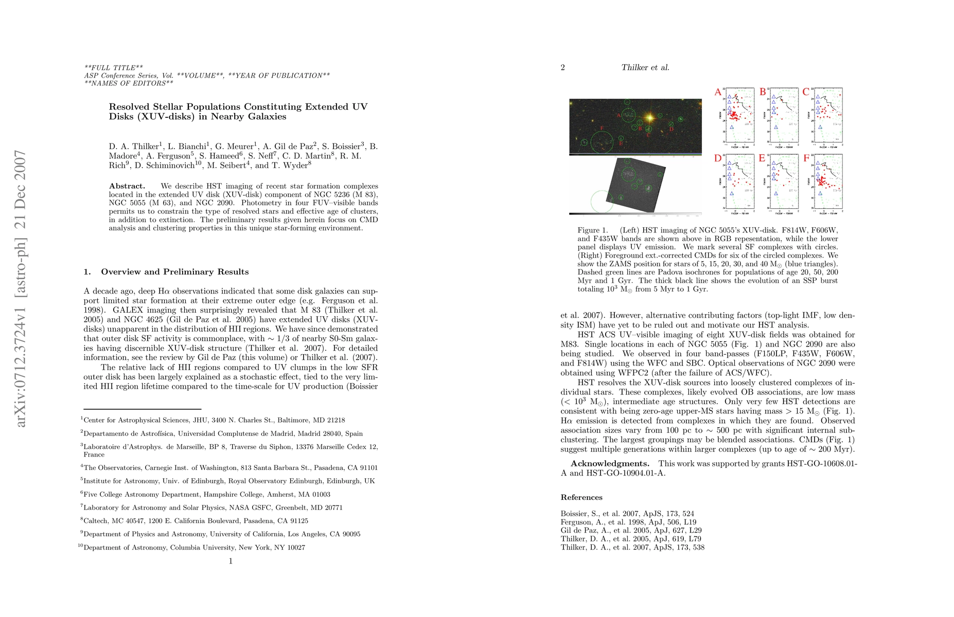 We describe HST imaging of recent star formation complexes located in the extended UV disk (XUV-disk) component of NGC 5236 (M 83), NGC 5055 (M 63), and NGC 2090. Photometry in four FUV--visible bands permits us to constrain the type of resolved stars and effective age of clusters, in addition to extinction. The preliminary results given herein focus on CMD analysis and clustering properties in this unique star-forming environment.
