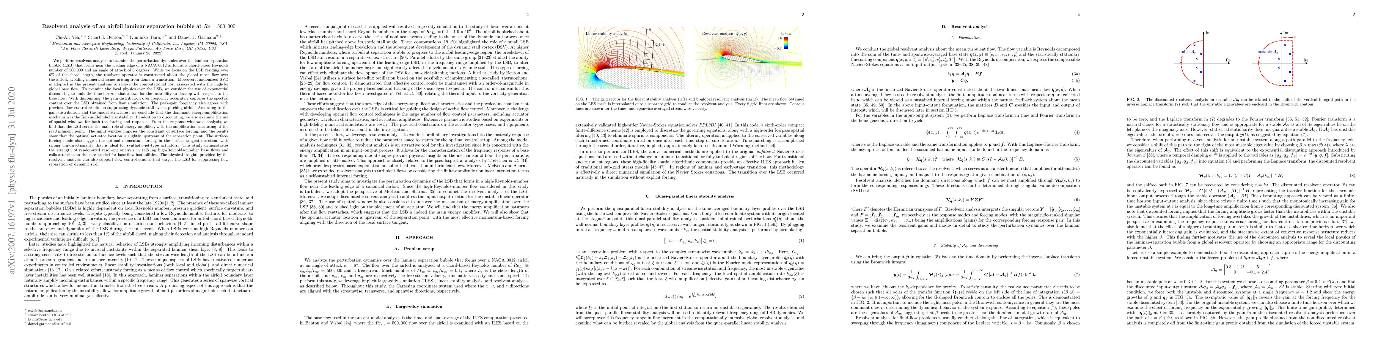 This study uses resolvent analysis to investigate the dynamics of a laminar separation bubble on a NACA 0012 airfoil at Re = 500,000, identifying the Kelvin-Helmholtz instability as the dominant energy-amplification mechanism. Randomized SVD and spatial windows reveal that the separation bubble acts as a primary energy amplifier, with optimal synthetic-jet actuators positioned slightly upstream of the separation point.