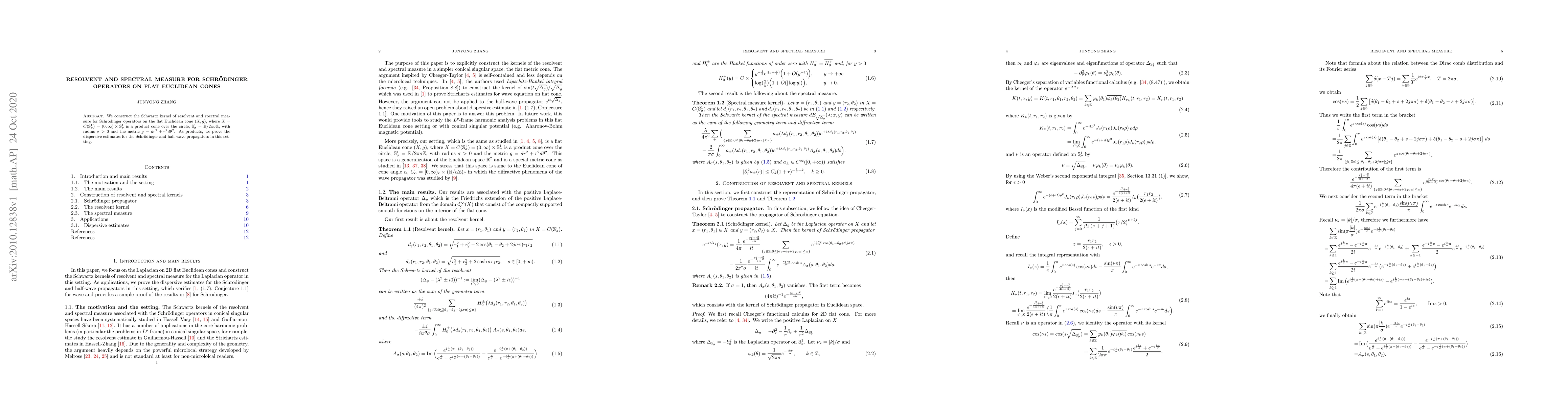 This paper constructs the Schwartz kernel of the resolvent and spectral measure for Schrödinger operators on flat Euclidean cones. It focuses on a specific cone $(X,g)$ derived from a product over the circle, proving dispersive estimates for the Schrödinger and half-wave propagators in this setting.