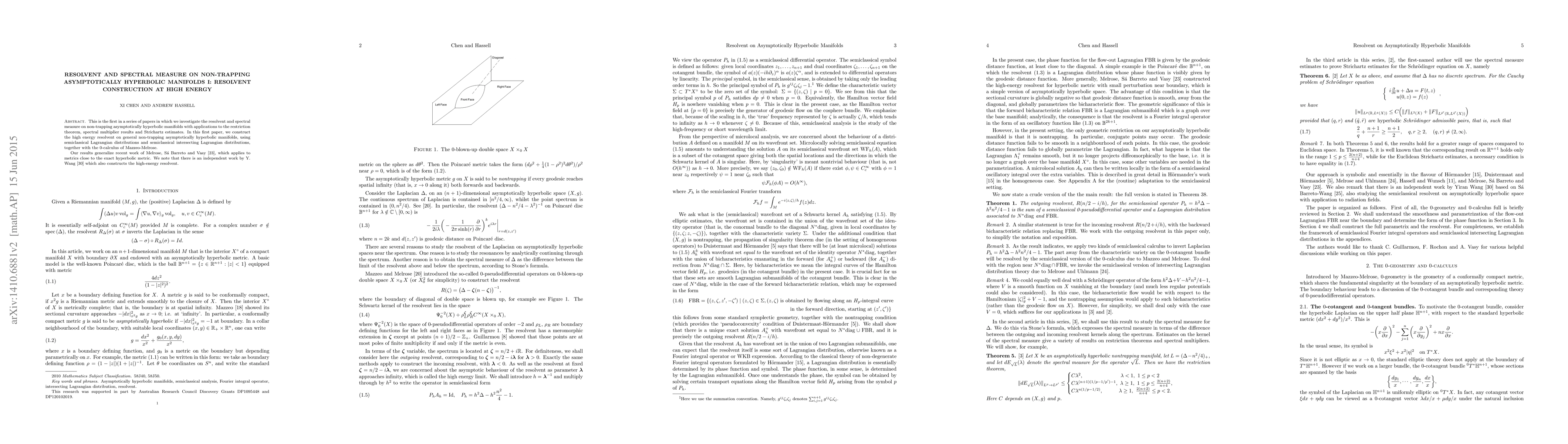 This is the first in a series of papers in which we investigate the resolvent and spectral measure on non-trapping asymptotically hyperbolic manifolds with applications to the restriction theorem, spectral multiplier results and Strichartz estimates. In this first paper, we use semiclassical Lagrangian distributions and semiclassical intersecting Lagrangian distributions, along with Mazzeo-Melrose 0-calculus, to construct the high energy resolvent on general non- trapping asymptotically hyperbolic manifolds, generalizing the work due to Melrose, Sa Barreto and Vasy. We note that there is an independent work by Y. Wang which also constructs the high-energy resolvent.
