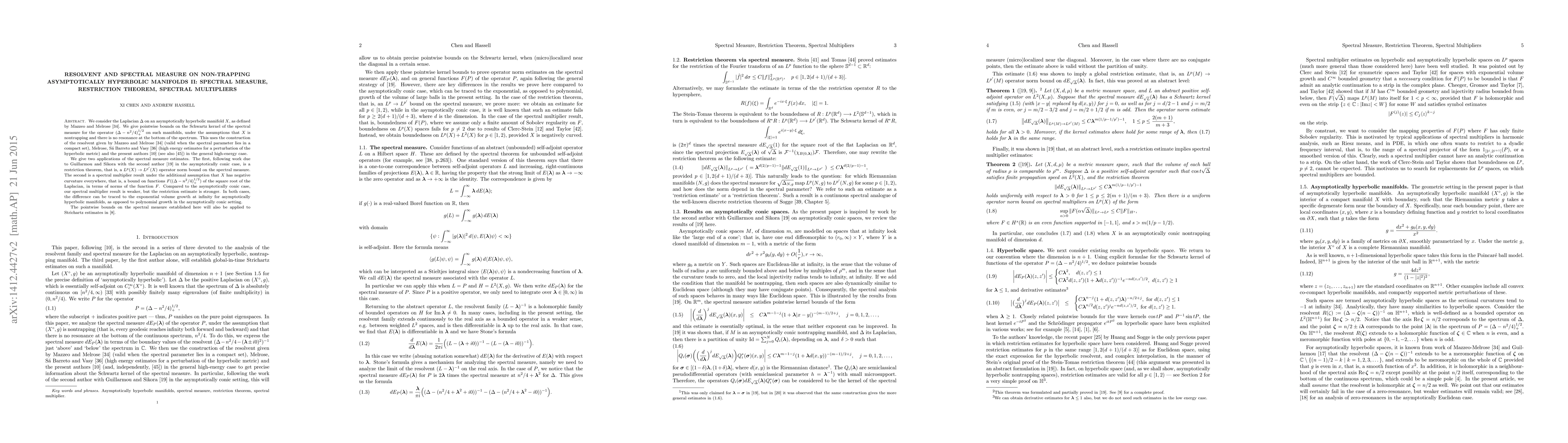 This paper provides pointwise bounds on the spectral measure for the Laplacian on non-trapping asymptotically hyperbolic manifolds, assuming no resonance at the spectrum's bottom. It establishes a restriction theorem and a spectral multiplier result under negative curvature, with the latter weaker but the former stronger than their conic counterparts due to volume growth differences.