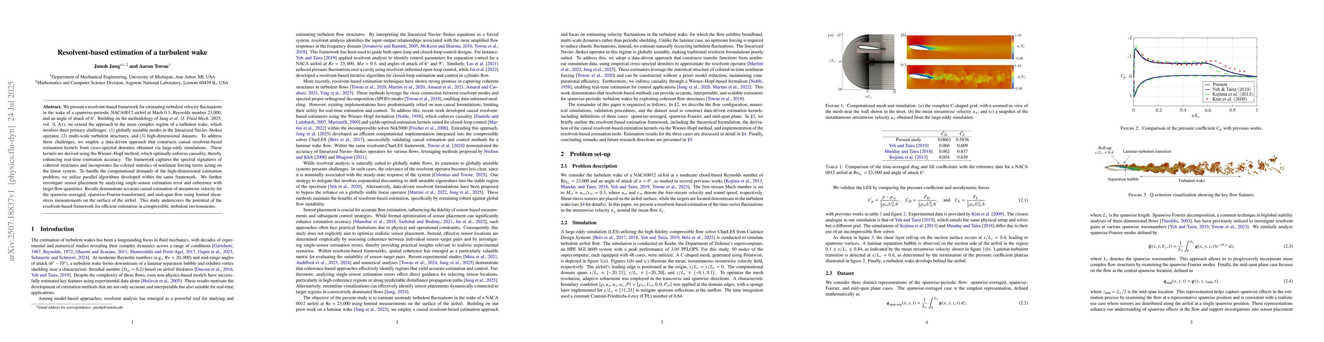 We present a resolvent-based framework for estimating turbulent velocity fluctuations in the wake of a spanwise-periodic NACA0012 airfoil at Mach 0.3, Reynolds number 23,000, and an angle of attack of 6 degrees. Building on the methodology of Jung et al. (J. Fluid Mech. 2025, vol. 0, A1), we extend the approach to the more complex regime of a turbulent wake, which involves three primary challenges: (1) globally unstable modes in the linearized Navier-Stokes operator, (2) multi-scale turbulent structures, and (3) high-dimensional datasets. To address these challenges, we employ a data-driven approach that constructs causal resolvent-based estimation kernels from cross-spectral densities obtained via large-eddy simulations. These kernels are derived using the Wiener-Hopf method, which optimally enforces causality, thereby enhancing real-time estimation accuracy. The framework captures the spectral signatures of coherent structures and incorporates the colored statistics of nonlinear forcing terms acting on the linear system. To handle the computational demands of the high-dimensional estimation problem, we utilize parallel algorithms developed within the same framework. We further investigate sensor placement by analyzing single-sensor estimation error and coherence with target flow quantities. Results demonstrate accurate causal estimation of streamwise velocity for the spanwise-averaged, spanwise-Fourier-transformed, and mid-span flow using limited shear-stress measurements on the surface of the airfoil. This study underscores the potential of the resolvent-based framework for efficient estimation in compressible, turbulent environments.