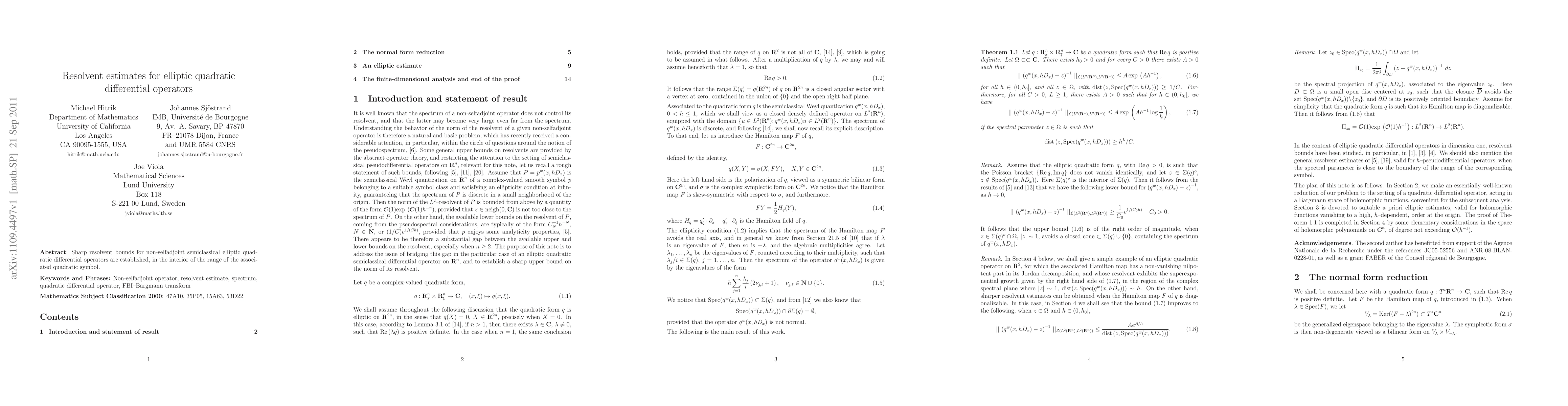 Summary: The paper establishes sharp resolvent bounds for non-selfadjoint semiclassical elliptic quadratic differential operators within the interior of the range of their associated quadratic symbol. These estimates provide deeper insights into the operator's spectral properties.