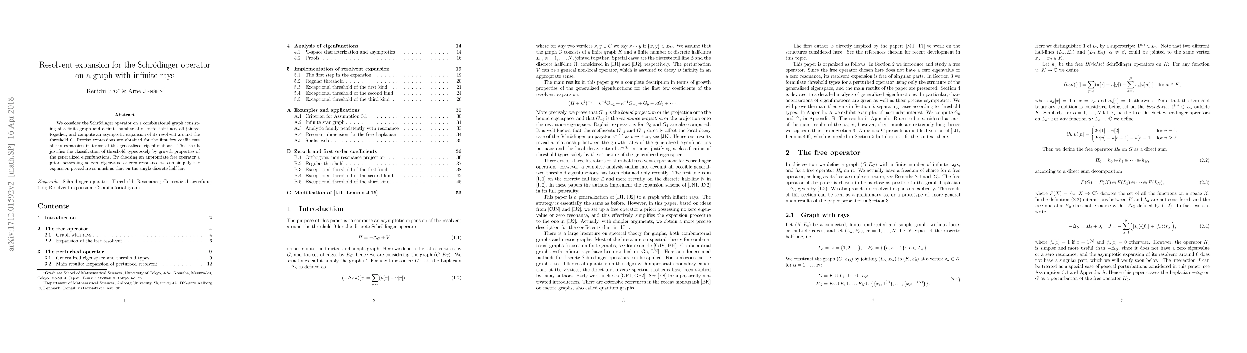 We consider the Schr\"odinger operator on a combinatorial graph consisting of a finite graph and a finite number of discrete half-lines, all jointed together, and compute an asymptotic expansion of its resolvent around the threshold $0$. Precise expressions are obtained for the first few coefficients of the expansion in terms of the generalized eigenfunctions. This result justifies the classification of threshold types solely by growth properties of the generalized eigenfunctions. By choosing an appropriate free operator a priori possessing no zero eigenvalue or zero resonance we can simplify the expansion procedure as much as that on the single discrete half-line.