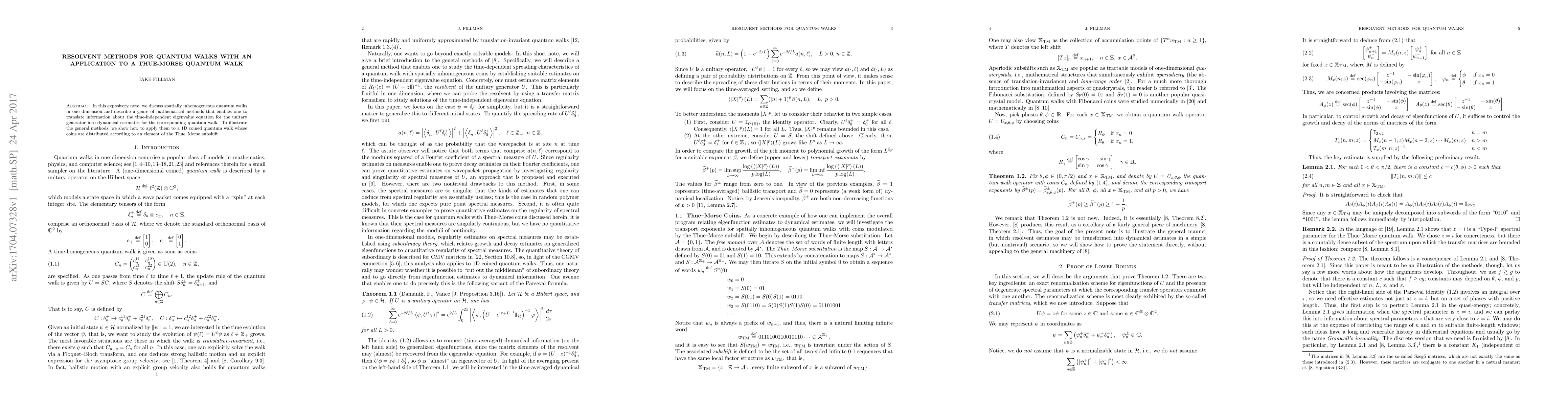 This paper explores spatially inhomogeneous quantum walks in one dimension and introduces resolvent methods to link eigenvalue information of the unitary generator to dynamical properties of the quantum walk. It specifically applies these methods to a 1D Thue-Morse quantum walk, demonstrating the utility of the approach.