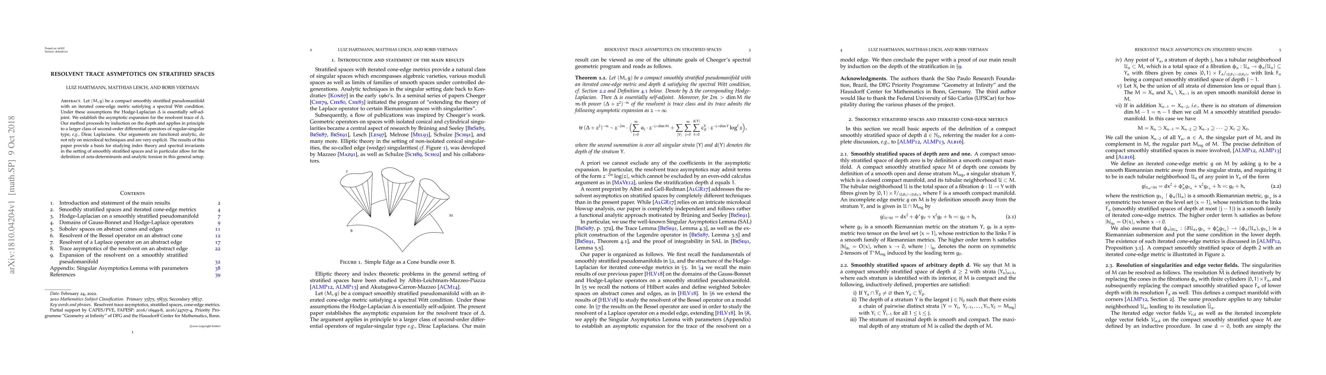 Let $(M,g)$ be a compact smoothly stratified pseudomanifold with an iterated cone-edge metric satisfying a spectral Witt condition. Under these assumptions the Hodge-Laplacian $\Delta$ is essentially self-adjoint. We establish the asymptotic expansion for the resolvent trace of $\Delta$. Our method proceeds by induction on the depth and applies in principle to a larger class of second-order differential operators of regular-singular type, e.g., Dirac Laplacians. Our arguments are functional analytic, do not rely on microlocal techniques and are very explicit. The results of this paper provide a basis for studying index theory and spectral invariants in the setting of smoothly stratified spaces and in particular allow for the definition of zeta-determinants and analytic torsion in this general setup.