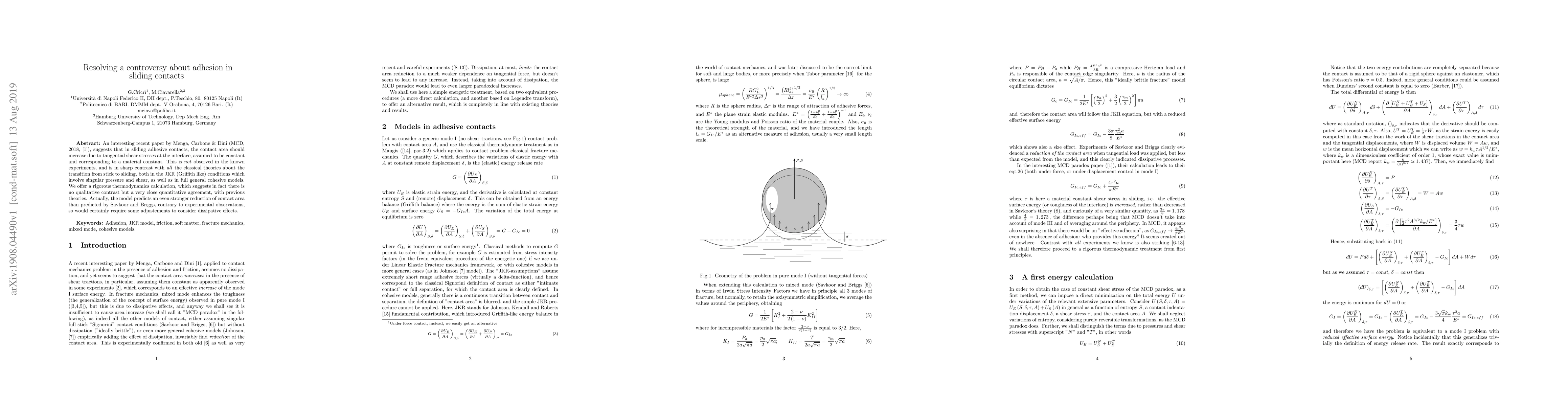 An interesting recent paper by Menga, Carbone & Dini (MCD, 2018, [1]), suggests that in sliding adhesive contacts, the contact area should increase due to tangential shear stresses at the interface, assumed to be constant and corresponding to a material constant. This is not observed in the known experiments, and is in sharp contrast with all the classical theories about the transition from stick to sliding, both in the JKR (Griffith like) conditions which involve singular pressure and shear, as well as in full general cohesive models. We offer a rigorous thermodynamics calculation, which suggests in fact there is no qualitative contrast but a very close quantitative agreement, with previous theories. Actually, the model predicts an even stronger reduction of contact area than predicted by Savkoor and Briggs, contrary to experimental observations, so would certainly require some adjustements to consider dissipative effects.