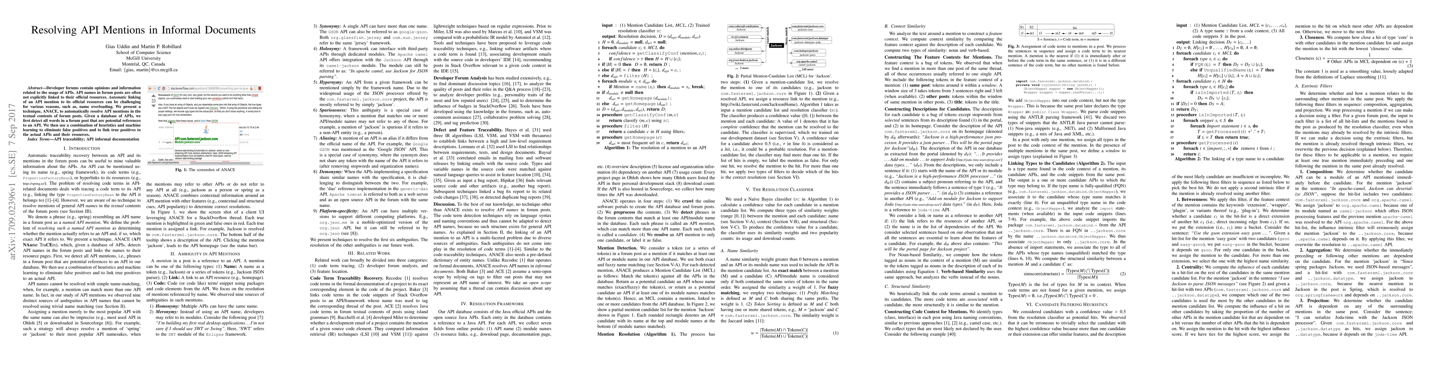 Developer forums contain opinions and information related to the usage of APIs. API names in forum posts are often not explicitly linked to their official resources. Automatic linking of an API mention to its official resources can be challenging for various reasons, such as, name overloading. We present a technique, ANACE, to automatically resolve API mentions in the textual contents of forum posts. Given a database of APIs, we first detect all words in a forum post that are potential references to an API. We then use a combination of heuristics and machine learning to eliminate false positives and to link true positives to the actual APIs and their resources.