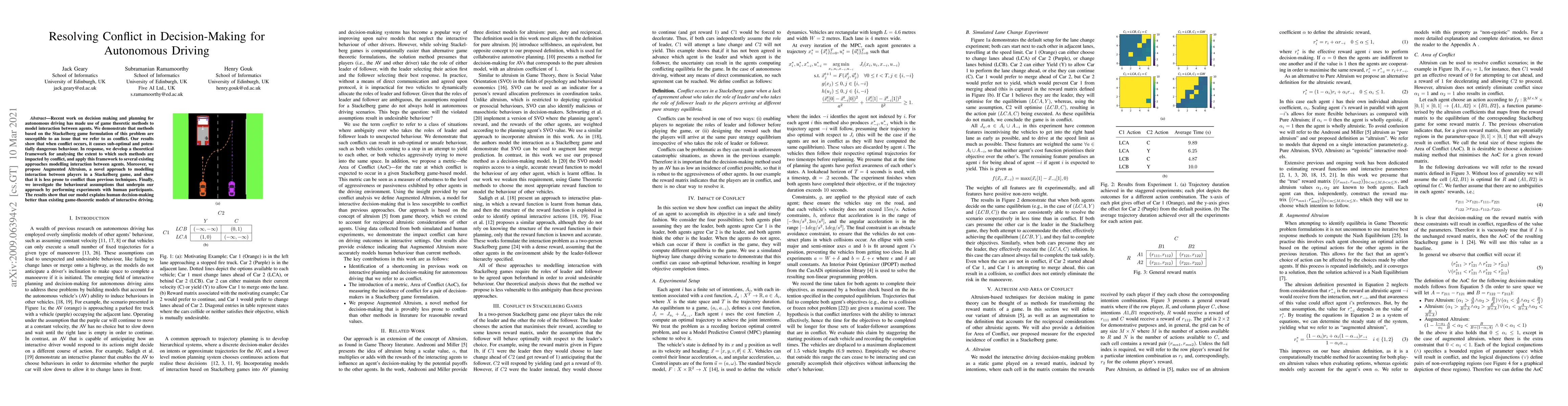 Recent work on decision making and planning for autonomous driving has made use of game theoretic methods to model interaction between agents. We demonstrate that methods based on the Stackelberg game formulation of this problem are susceptible to an issue that we refer to as conflict. Our results show that when conflict occurs, it causes sub-optimal and potentially dangerous behaviour. In response, we develop a theoretical framework for analysing the extent to which such methods are impacted by conflict, and apply this framework to several existing approaches modelling interaction between agents. Moreover, we propose Augmented Altruism, a novel approach to modelling interaction between players in a Stackelberg game, and show that it is less prone to conflict than previous techniques. Finally, we investigate the behavioural assumptions that underpin our approach by performing experiments with human participants. The results show that our model explains human decision-making better than existing game-theoretic models of interactive driving.
