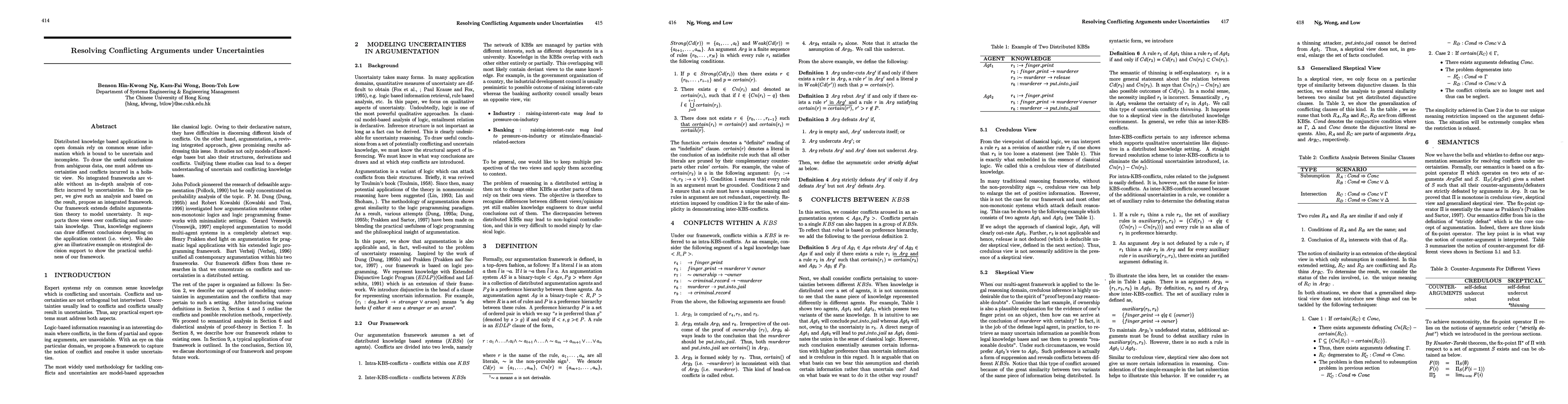Distributed knowledge based applications in open domain rely on common sense information which is bound to be uncertain and incomplete. To draw the useful conclusions from ambiguous data, one must address uncertainties and conflicts incurred in a holistic view. No integrated frameworks are viable without an in-depth analysis of conflicts incurred by uncertainties. In this paper, we give such an analysis and based on the result, propose an integrated framework. Our framework extends definite argumentation theory to model uncertainty. It supports three views over conflicting and uncertain knowledge. Thus, knowledge engineers can draw different conclusions depending on the application context (i.e. view). We also give an illustrative example on strategical decision support to show the practical usefulness of our framework.