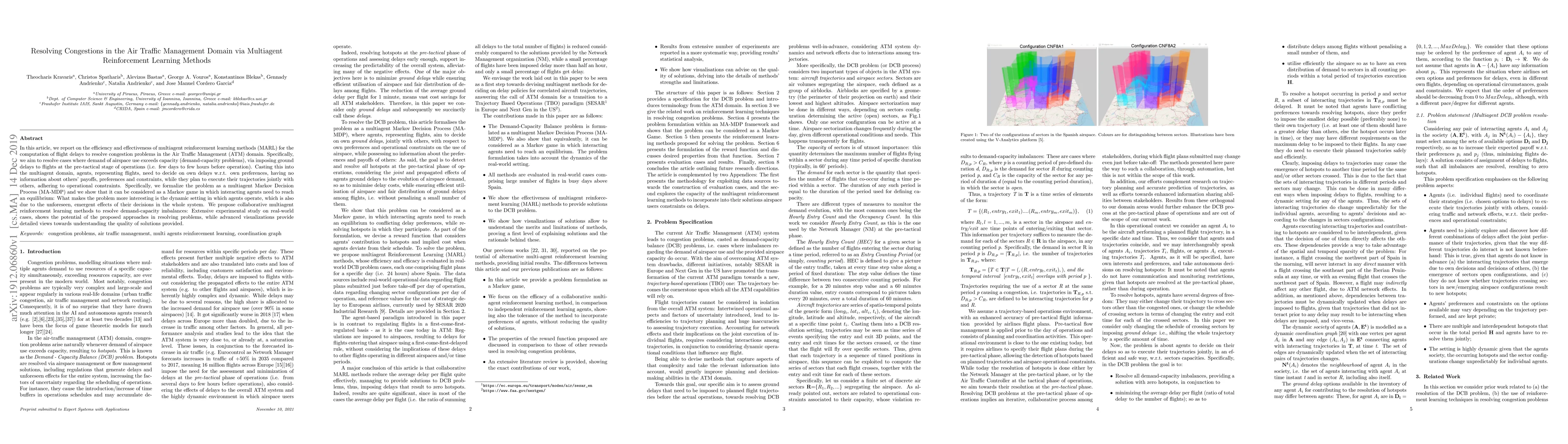 In this article, we report on the efficiency and effectiveness of multiagent reinforcement learning methods (MARL) for the computation of flight delays to resolve congestion problems in the Air Traffic Management (ATM) domain. Specifically, we aim to resolve cases where demand of airspace use exceeds capacity (demand-capacity problems), via imposing ground delays to flights at the pre-tactical stage of operations (i.e. few days to few hours before operation). Casting this into the multiagent domain, agents, representing flights, need to decide on own delays w.r.t. own preferences, having no information about others' payoffs, preferences and constraints, while they plan to execute their trajectories jointly with others, adhering to operational constraints. Specifically, we formalize the problem as a multiagent Markov Decision Process (MA-MDP) and we show that it can be considered as a Markov game in which interacting agents need to reach an equilibrium: What makes the problem more interesting is the dynamic setting in which agents operate, which is also due to the unforeseen, emergent effects of their decisions in the whole system. We propose collaborative multiagent reinforcement learning methods to resolve demand-capacity imbalances: Extensive experimental study on real-world cases, shows the potential of the proposed approaches in resolving problems, while advanced visualizations provide detailed views towards understanding the quality of solutions provided.