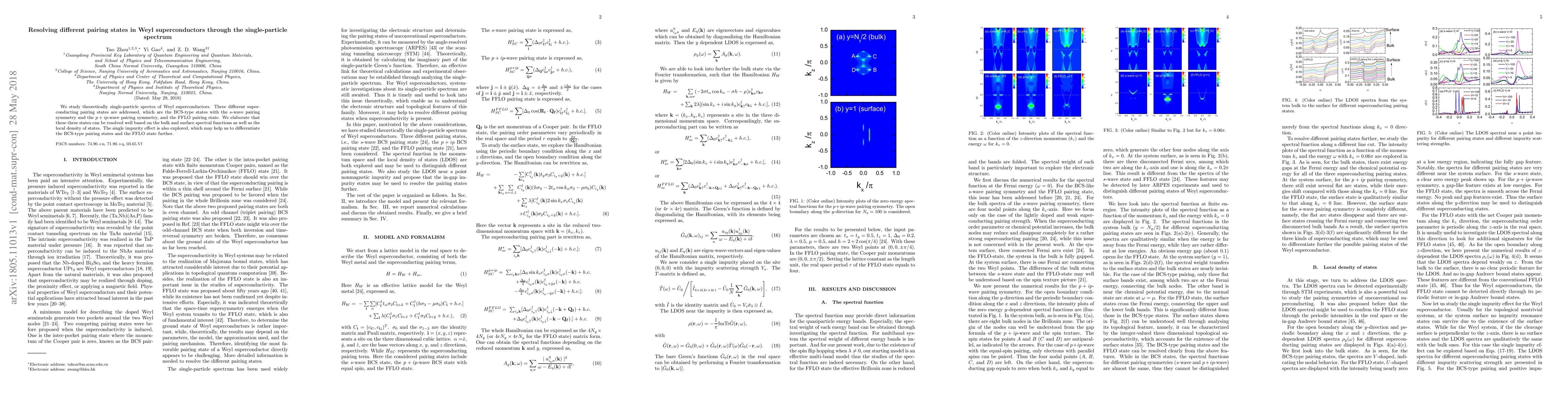 This paper theoretically investigates the single-particle spectra of Weyl superconductors, focusing on three pairing states: BCS-type $s$-wave, $p+ip$-wave, and FFLO states. It demonstrates that these states can be distinguished through bulk and surface spectral functions and local density of states, with additional insights from the single impurity effect.