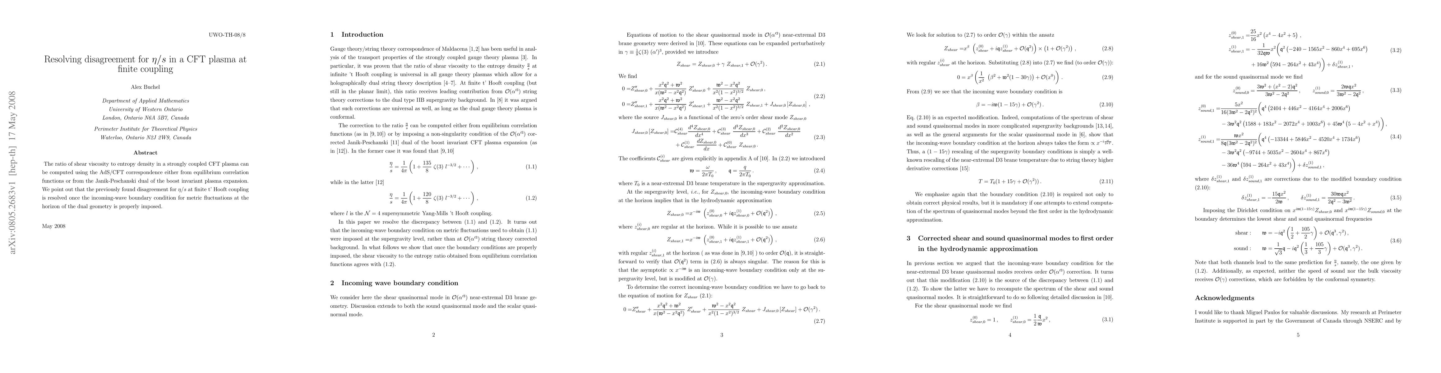 This paper resolves the previously noted discrepancy in the computation of the shear viscosity to entropy density ratio (eta/s) in strongly coupled conformal field theory (CFT) plasmas at finite coupling, demonstrating that the disagreement arises from the improper application of boundary conditions in the dual geometry. Correctly imposing the incoming-wave boundary condition at the horizon resolves the inconsistency.