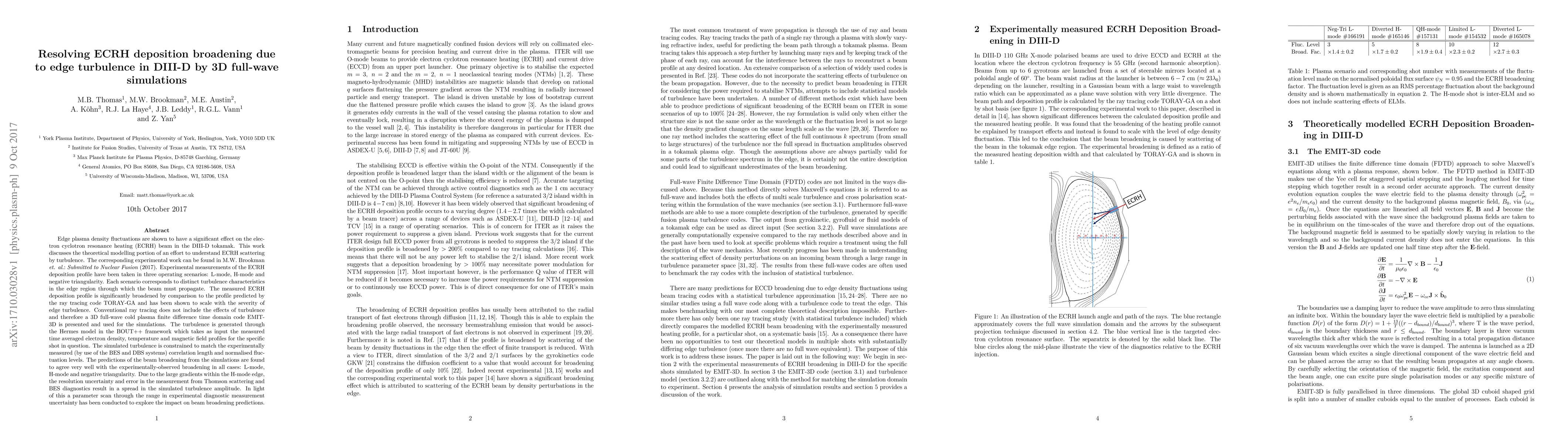 This paper investigates the broadening of electron cyclotron resonance heating (ECRH) deposition profiles in the DIII-D tokamak due to edge plasma turbulence. A 3D full-wave simulation, EMIT-3D, is used to model the turbulence effects, showing good agreement with experimental measurements across different operational modes.