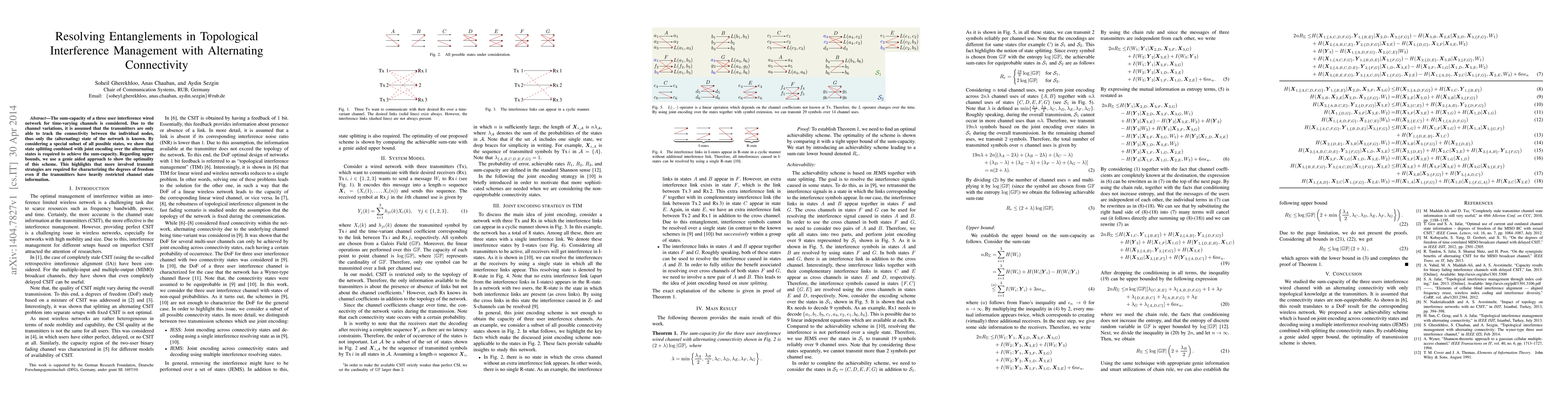 The sum-capacity of a three user interference wired network for time-varying channels is considered. Due to the channel variations, it is assumed that the transmitters are only able to track the connectivity between the individual nodes, thus only the (alternating) state of the network is known. By considering a special subset of all possible states, we show that state splitting combined with joint encoding over the alternating states is required to achieve the sum-capacity. Regarding upper bounds, we use a genie aided approach to show the optimality of this scheme. This highlights that more involved transmit strategies are required for characterizing the degrees of freedom even if the transmitters have heavily restricted channel state information.